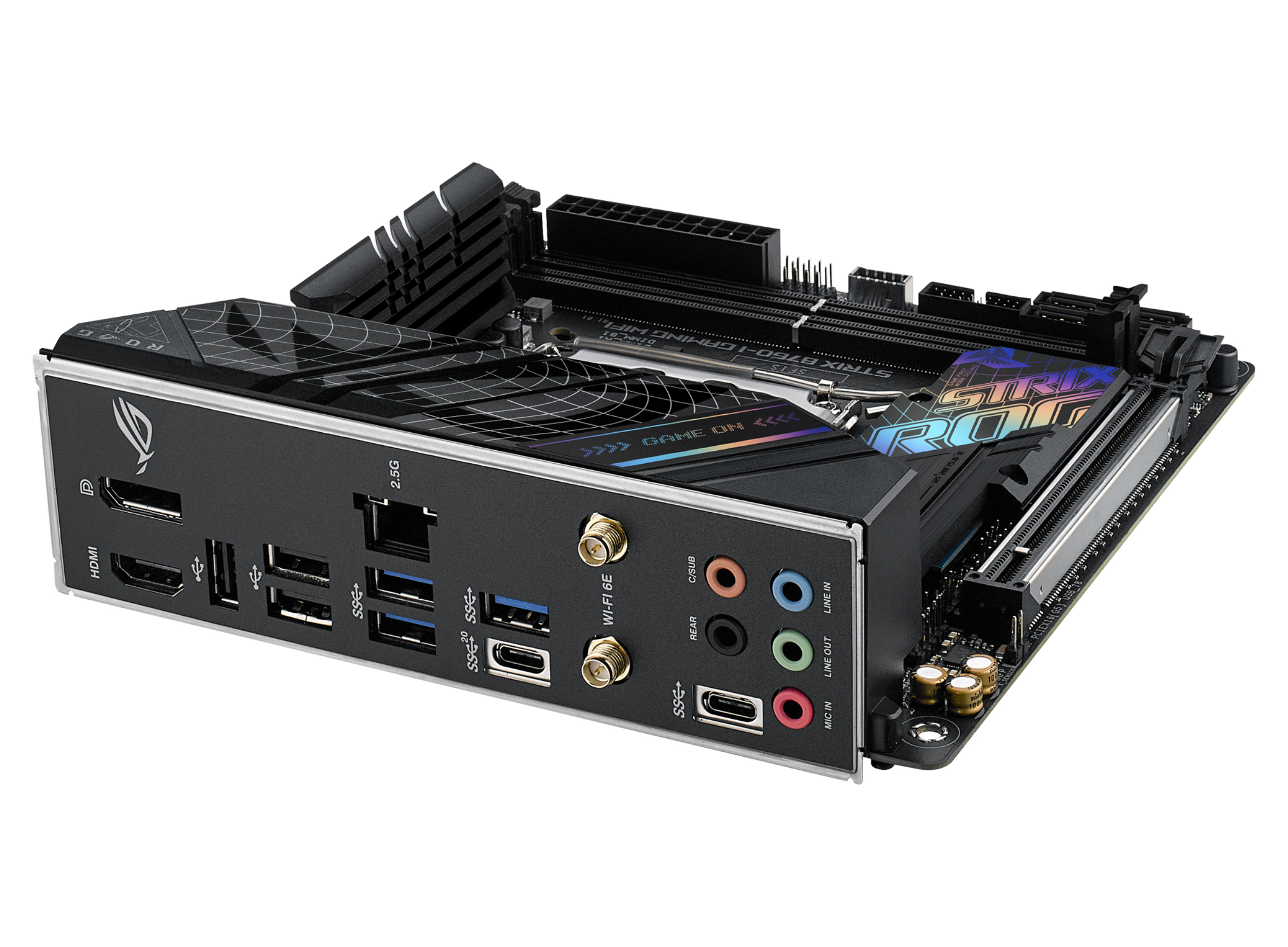 Let your rig run wild with the ROG Strix B760-I, a feisty foundation for your next SFF build. Boasting hyperfast DDR5 memory, low-latency WiFi 6E networking, and a future-ready PCIe 5.0 slot, it sets you up for savage speeds, all while giving you incredible 13th Gen support thanks to its powerful VRM and thermal solution. DIY-FRIENDLY FEATURES M.2 Q-LATCH The innovative Q-Latch makes it easy to install or remove an SSD from an M.2 slot. The design employs a simple locking mechanism to secure the drive, eliminating the need for a traditional screw. Q-LED Four onboard LEDs indicate power status and identify problems with CPU, memory, graphics card, or boot device for quick diagnosis. PRE-MOUNTED I/O SHIELD The patented ROG I/O shield is finished in sleek matte black and comes pre-mounted, which further simplifies the process of installing the motherboard. ALL-ROUND PERFORMANCE Bulking up where it counts, the ROG Strix B760-I bears an octet of power stages mounted with a hefty cooling array to give you all the fury of Raptor Lake. To pack on the FPS, the PCIe 5.0 slot is primed for the mightiest graphics card you can fit your chassis, and the memory slots can handle dizzying DDR5 speeds. POWER ARCHITECTURE 8 + 1 power stages each rated to 80A deliver ample current to drive the most powerful Intel 13th Gen processors through any workload with ease. ALLOY CHOKES AND DURABLE CAPACITORS High-end chokes and durable capacitors are engineered to resist extreme temperatures, enabling performance that exceeds industry standards. EIGHT-LAYER PCB A multi-layered printed circuit board design quickly dissipates heat around the voltage regulators to improve overall system stability. DDR5 DOMINATION ROG has a long legacy of flexing the fastest memory performance, and DDR5 is no outlier. Thanks to improved signal routing, now enthusiast-grade kits have been driven far beyond the 7 GT/s mark on the Strix B760-I, and who knows how far future DIMMs can go? Seasoned veterans can test their mettle by tinkering with the extensive array of tuning options in the UEFI. AEMP II ASUS Enhanced Memory Profile (AEMP) is an exclusive hardware and firmware solution to overclock generic memory modules. AEMP’s second version allows for automatic tuning of kits during system startup and leverages the PCB trace optimizations of the Strix B760-I to push frequencies higher than ever before. AEMP II can even overclock mixed kits in a quad-DIMM arrangement, and the vast library of support now extends to nearly every DDR5 module that does not otherwise have XMP support. VRM HEATSINK ARRAY Covering the power solution are two thick heatsinks with strategic airflow channels for increased heat dissipation while powering high-performance Intel 13th Gen processors. M.2 HEATSINK A large heatsink covers the front NVME SSD slot to help keep your drive at optimal temperatures for consistent performance and reliability. M.2 BACKPLATE Additional mass is underneath the slot to deal with the thermal load of high-performance M.2 drives. CPU FAN HEADER Positioned near the top of the motherboard, a PWM/DC fan header gives easy access for CPU coolers. AIO PUMP FAN HEADER A dedicated PWM/DC header connects self-contained water-cooling setups. 4-PIN FAN HEADER The Strix B760-I features a chassis fan header that auto-detects any PWM or DC fan connected to it. LEADING CONNECTIVITY Massive throughput flows through the ROG Strix B760-I via advanced networking adapters and high-bandwidth USB connectors, allowing you to rip through games with no interference, and crystal clear on-board audio keeps you immersed in the experience. The x16 expansion slot is ready for the future with incredible PCIe 5.0 bandwidth, and it is protected with a SafeSlot retention bracket to support the bulk of the latest graphics cards. Zippy storage comes courtesy of the pair of PCIe 4.0 M.2 slots, one under the front-side heatsink, and the other positioned on the back to save space. WIFI 6E Onboard WiFi 6E technology takes advantage of newly available spectrum in the 6 GHz band to provide up to seven 160 MHz channels for ultrafast throughput and better performance in dense wireless environments. *WiFi 6E availability and features are dependent on regulatory limitations and co-existence with 5 GHz WiFi. Intel 2.5G Ethernet Low-latency gaming, speedy file transfers, and high-resolution video streaming are among the many perks of onboard Intel® 2.5 Gbps Ethernet. The Strix B760-I comes loaded with multiple high-speed USB options. Five of the rear I/O ports are USB 3.2-compliant, with the fastest being a USB 3.2 Gen 2x2 Type-C® port for data transfers up to 20 Gbps. A chassis port can also receive turbo treatment via the USB Gen 3.2 Gen 2 front-panel connector. SUPREMEFX ROG SupremeFX is a unique blend of hardware and software technologies that provide superior audio. The Strix B760-I implementation features the S1220A codec for high-resolution playback up to 32-bit/192 kHz across all channels. Front-panel output is streamed through the integrated Savitech amplifier that can drive high-fidelity acoustics to a wide variety of speakers and headsets. PLAY IN STYLE The black shrouds and PCB of the Strix B760-I pair well with most products from the diverse ROG ecosystem, all while making your build distinct with a dash of polychromatic contrast. UNDENIABLY ROG STRIX In compact builds with a vertically-mounted graphics card, the ROG Strix B760-I keeps a low profile, as only the top of a wavy grid decal is likely to peek through. But if the build has a bit more space, a pair of bold pastel insignias give some colorful flair amid the otherwise stealthy fascia. COOLER COMPATIBILITY The ROG Strix B760-I bears the same LGA 1700 socket as Z690 and B660 models, so many existing coolers are compatible, including all AIO offerings from ASUS and ROG. THE ROG STRIX ECOSYSTEM AWAITS Level up your game with ROG Strix. Enjoy complimentary aesthetics, control, and compatibility across AIO coolers, c