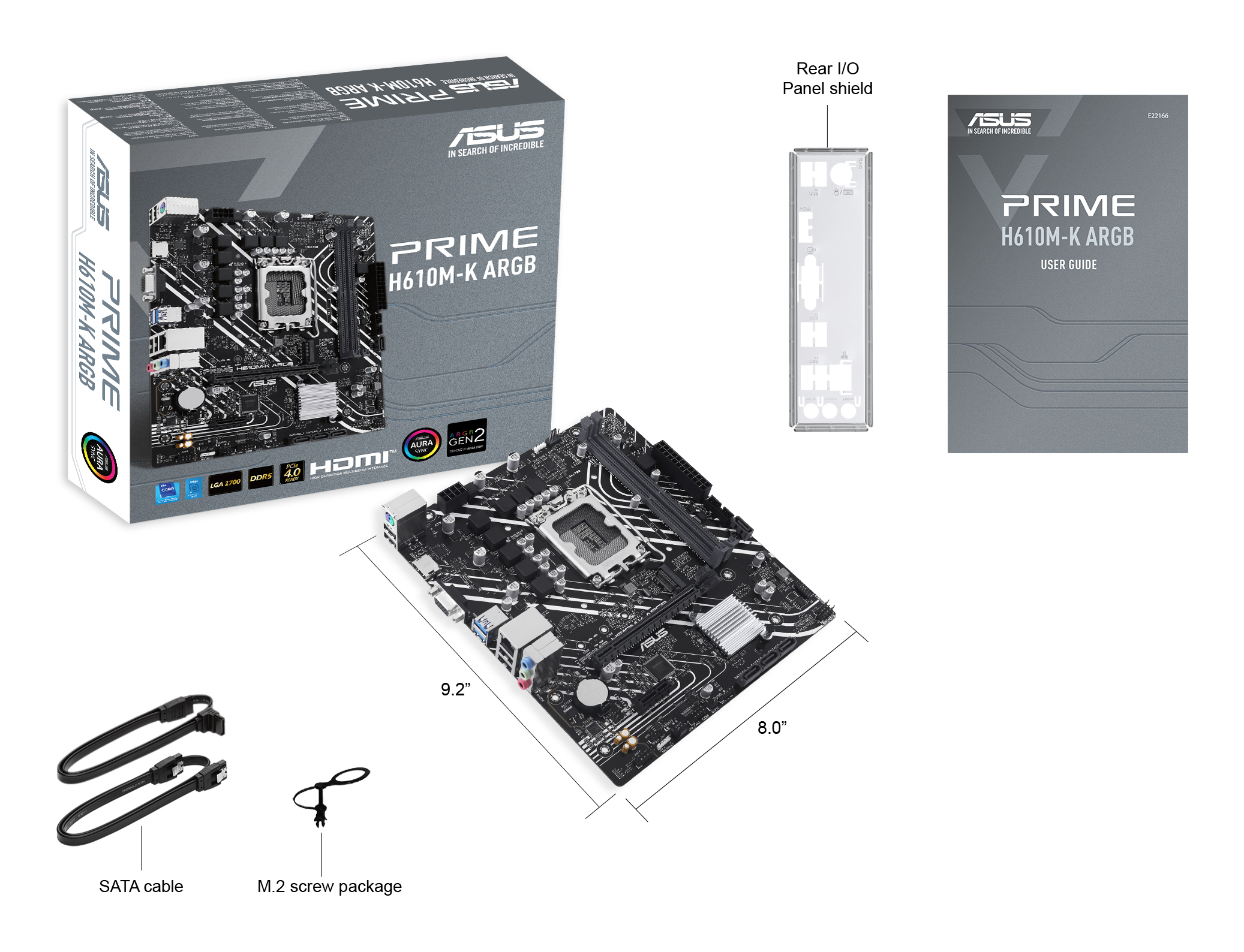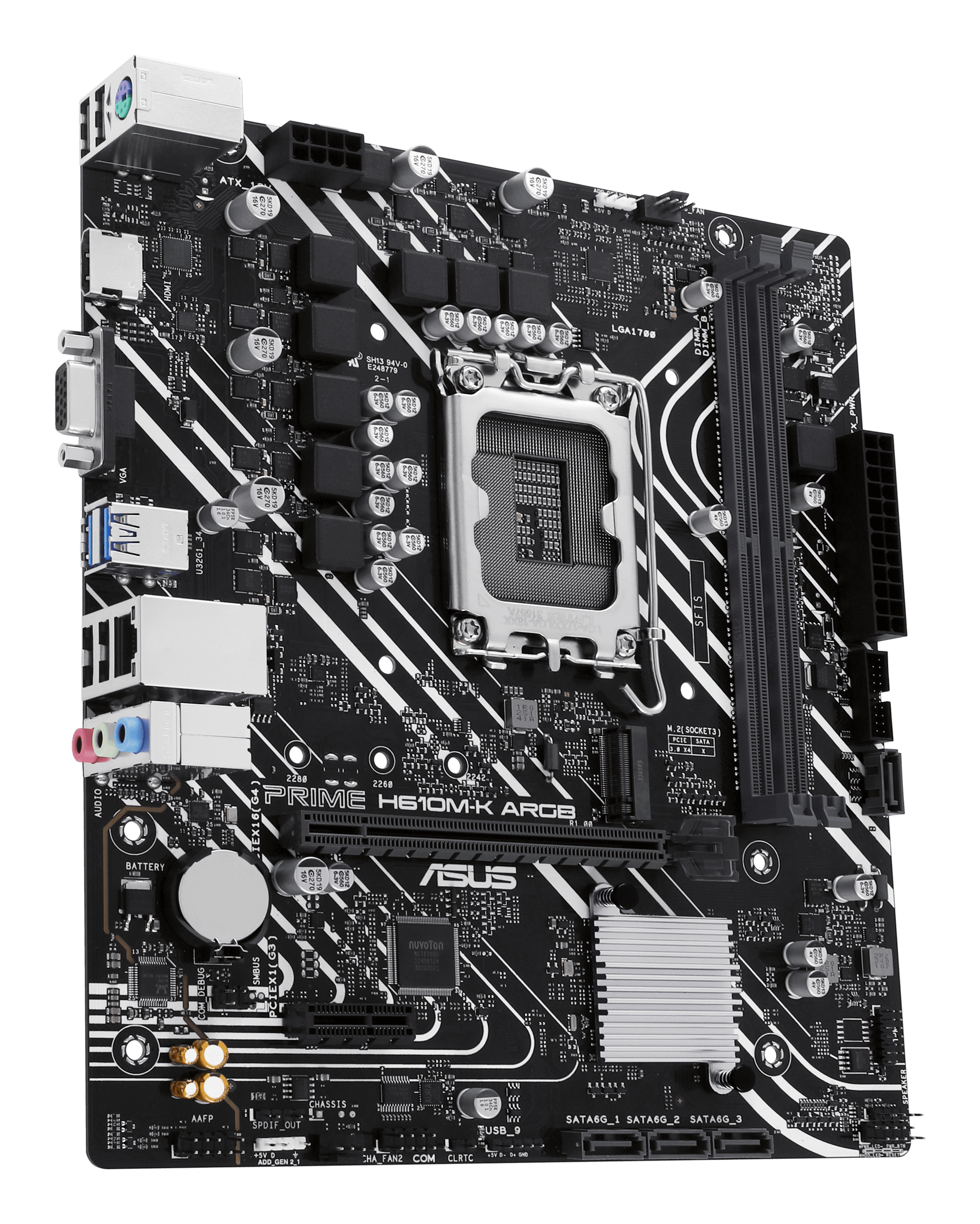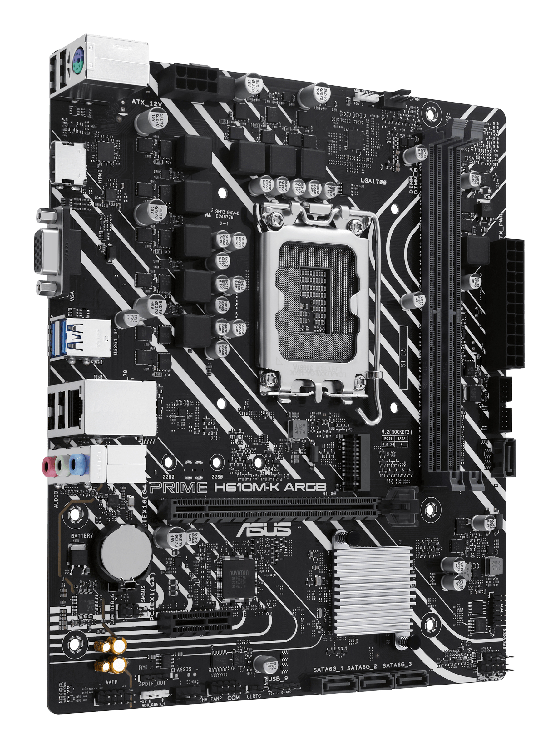 ASUS Prime series motherboards are expertly engineered to unleash the full potential of 13th & 12th Generation Intel® processors. Boasting a robust power design, comprehensive cooling solutions and intelligent tuning options, Prime H610 provides users and PC DIY builders a range of performance tuning options via intuitive software and firmware features. FLEXIBILITY Comprehensive controls form the foundation of the ASUS Prime series. The Prime H610 motherboard packs flexible tools to tune every aspect of your system, enabling performance tweaks to perfectly match the way you work to maximize productivity. Intelligent Control All-Around Energy Efficiency The Energy Processing Unit (EPU) automatically optimizes power consumption and maximizes energy savings with Away mode — a smart setting that creates an extreme energy-saving scenario by shutting down unused I/O controllers. Flexible cooling controls Prime 600 Series motherboards offer comprehensive control over system fans, via the included Fan Xpert 2+ software. Auto-Tuning mode intelligently configures all parameters with a single click. Precise Digital Power Control The Digi+ voltage-regulator module (VRM) delivers real-time control over voltage droop, automatically switching frequency and power-efficiency settings. It also allows you to fine-tune your CPU for ultimate stability and performance. UEFI BIOS The renowned ASUS UEFI BIOS provides everything you need to configure, tweak and tune your system. It offers intelligently simplified options for PC DIY beginners, as well as comprehensive features for seasoned veterans. Advanced Tuning for Serious Tweakers An intuitive Advanced mode offered via the UEFI lets you take complete control. A built-in search feature makes it easy to find options, and various advanced functions let you intelligently make nuanced adjustments so you can dial in performance just the way you want. Search Function Quickly and easily find the option or setting you need. ASUS User Profile Port configuration settings between different BIOS versions or share them with friends. Quick and Simple Setup EZ mode displays vital settings and stats and also offers guided wizards, drag-and-drop functionality, and one-click application of important settings — all to help you get your rig up and running in no time. Intuitive Graphical Fan Control Fine-tune individual fan settings simply by dragging a curve with the mouse. EZ XMP Improve DRAM performance with one click. Aura On/Off Mode (Stealth) Easily enable or disable Aura RGB lighting or every onboard LED, for a subdued aesthetic touch. COOLING Cooler by Design Prime H610 series feature comprehensive cooling controls that are configurable via Fan Xpert 2+ software or via the UEFI BIOS. Multiple Temperature Sources Each header can dynamically reference three thermal sensors. Fan Xpert 2+ allows you to map the temperature of supported ASUS graphics cards to optimize cooling for GPU- and CPU-intensive tasks. Smart Protection A dedicated integrated circuit protects each fan header from overheating and overcurrent. 4-Pin PWM/DC Fan Each onboard header supports auto-detection of PWM or DC fans. PERFORMANCE Prime H610 series are built to handle the additional cores and increased bandwidth of 13th & 12th Generation Intel® processors. ASUS H610 motherboards provide all the fundamentals to boost daily productivity, so your system will be ready for action with stable power, intuitive cooling and flexible transfer options. Memory DDR5 Performance Comprehensive memory tuning options are the cornerstone of PRIME motherboards. With the PRIME H610M-K ARGB, you can extract all of the potential out of your DDR5 modules, whether they're from an extreme-speed kit or an entry-level set that would otherwise be locked. For those who want to fly past stock DDR5 speeds, the PRIME H610M-K ARGB is primed and ready for enthusiast-grade kits courtesy of Intel® Extreme Memory Profile (XMP) support. Seasoned veterans can further tweak performance via the extensive array of settings in the UEFI. Storage M.2 slot (up to 32 Gbps) PRIME H610M-K ARGB offers one M.2 slot that supports data-transfer speeds of up to 32 Gbps via PCIe 3.0, enabling quicker boot-up and app load times with OS or application drives. Connectivity PCIe 4.0 Prime H610 motherboards are designed specifically for 13th & 12th Generation Intel® Core™ CPUs and offer PCIe 4.0 connectivity for GPUs. The wide bandwidth and superfast transmission speeds allow you to create feature-rich builds that can handle high loads effortlessly. USB 3.2 Gen 1 Type-A Numerous USB ports support high-end rigs loaded with peripherals, including rear-panel USB Type-A connectors with fast USB 3.2 Gen 1 connectivity for compatible cases. Audio Combined onboard features deliver elevated audio Intelligent design and premium hardware create audio quality unlike anything you’ve ever experienced. Audio Shielding Audio shielding ensures precision analog/digital separation and greatly reduced multi-lateral interference. Dedicated Audio PCB Layers Separate layers for left and right tracks ensures both channels deliver consistent, equal quality. Premium Audio Capacitors Provides warm, natural, and immersive sound with exceptional clarity and fidelity. Two-Way AI Noise Cancelation This utility leverages a massive deep-learning database to reduce background noise from the microphone and incoming audio, while preserving vocals at the same time. This removes distracting keyboard clatter, mouse clicks and other ambient noises so you can hear and be heard with crystal clarity while gaming or in calls. Personalization Aura Sync Outshine the Competition A well-tuned enthusiast system deserves a matching aesthetic. ASUS Aura offers full RGB lighting control with a variety of functional presets for the built-in RGB LEDs as well as strips and devices connected to the onboard RGB headers — and it can all be synced with an ever-growing portfolio of Aura-capable hardware. Ad