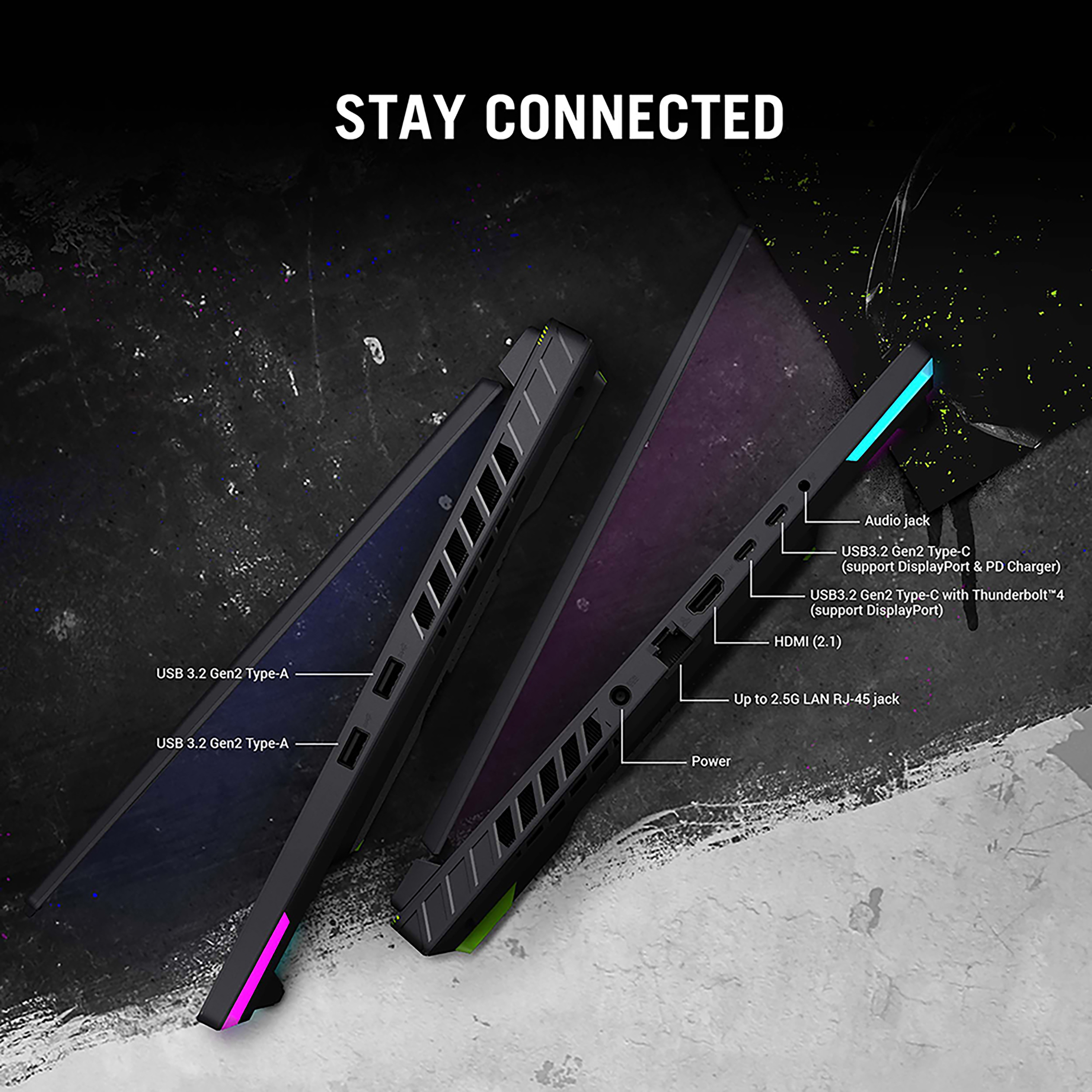 RAISE YOUR GAME. CARRY YOUR SQUAD. Power up your play Draw more frames and win more games with the brand new Strix G16 and Windows 11 Pro. Powered by up to a 13th Gen Intel® Core™ i9-13980HX Processor and up to an NVIDIA GeForce RTX 4080 Laptop GPU boasting a max TGP of 175W with Dynamic Boost, be ready to dominate the competition in all of the latest games. Backed up with a dedicated MUX Switch and NVIDIA Advanced Optimus support, the Strix G16 unlocks the true potential of its hardware. With PCIe Gen4x4 SSD storage and up to 32GB of 4800MHz DDR5 RAM, large game libraries and intense multitasking sessions are a breeze for this gaming machine. Do it all Power through any game or project with an Intel® Core™ i9-13980HX processor, featuring up to a 65W TDP and a hybrid architecture built from the ground up for Windows 11. With up to 8 Performance cores and 16 Efficiency cores, AAA gaming is flawless and streaming is effortless. GPU Power Unleashed Top-tier components require power, especially when it comes to maximizing your GPU’s performance. Powered by NVIDIA DLSS 3, ultra-efficient Ada Lovelace arch, and Max-Q Technologies, the NVIDIA® GeForce RTX™ 4090 Laptop GPU is fully unleashed with a max TGP of 175W with Dynamic Boost. NVIDIA® Advanced Optimus With NVIDIA® Advanced Optimus, the laptop can automatically route frames from the discrete GPU directly to the display using a MUX switch, bypassing the integrated graphics. This pathing improves performance 5-10% compared to machines without a MUX Switch, making sure you get the absolute best gaming experience—all without needing touch a single button. This automatic switching also preserves your machine's battery life, as it can dynamically transition between the high power discrete GPU and the lower power integrated GPU. No matter what you’re doing, your machine will switch to the most optimized mode without you having to lift a finger. Blazing Fast DDR5 Memory Leveraging the brand new DDR5 standard, enjoy a huge generational performance jump to 4800MHz, with write times 50% faster than DDR4 equipped machines. This ultra fast memory makes all aspects of the laptop feel snappy, from intense gaming to light web browsing. Better. Faster. Stronger. Take on even the largest projects with confidence and a PCIe® Gen4 SSD. With raw throughput up to 7000MB/s, massive files and large games will load in the blink of an eye. GeForce RTX 40 Series Laptops Beyond Fast for Gamers and Creators AI-Powered Performance and Lifelike Graphics* Get a quantum leap in performance in games and creative apps with AI-powered DLSS 3 and enable lifelike virtual worlds with full ray tracing. Accelerate Your Ideas NVIDIA Studio takes your creative projects to the next level. Unlock RTX and AI acceleration in top creative apps, NVIDIA Studio drivers for max stability, and a suite of exclusive tools to fast-track your creativity. Optimized Power and Performance NVIDIA Max-Q is an advanced suite of AI-powered technologies that optimize your system for peak efficiency. This enables blazing-fast laptops that are thin, quiet, and have amazing battery life. *Cyberpunk 2077 image captured on a desktop with new Ray Tracing: Overdrive Mode ON, shown for illustrative purposes only. Actual performance varies by system. Game. Stream. Create. The Strix G series is built from the ground up for gamers — and, of course, game developers. The Strix G16 can run all of the latest game engines, enabling you to unlock your creativity and try your hand at making the next great game. Whether you’re a digital artist, streamer, video editor, or dabble with animation and game development, the Strix G16 has all the horsepower you need to take your creations to the next level. Featuring up to an Intel® Core™ i9 processor and up to an NVIDIA® GeForce RTX™ 40 Series Laptop GPU, complex projects on popular development tools like Unity and Autodesk render in a snap. You have what it takes to be the best on the battlefield, but are you ready to design the next one? To accommodate such powerful components, the Strix G16’s chassis and motherboard were both redesigned to accommodate our new full-width heatsink, whose fins were moved even closer to the exhaust vents for more efficient cooling. The full-width heatsink is built from three different sections, surrounding the motherboard with densely-packed fins for a total surface area of 174,183mm², a 71% increase from the 2022 Strix G15. This design maximizes the available pathing for hot air to escape the machine and drastically increases overall airflow. Finally, most gaming laptops have a dual fan cooling system, but the G16 was able to push the performance envelope even further with the introduction of a third fan that helps keep the GPU and VRAM cool. Paired with seven heatpipes and Conductonaut Extreme liquid metal on both the CPU and GPU*, the G16’s cooling system is a marvel of engineering. *Conductonaut Extreme liquid metal is applied to the GPU on models with an RTX™ 4080 GPU only You can’t beat the enemy if you don’t see them coming. The Strix G16 has ultra-fast panel options for every scenario, making sure you’ll never miss a moment. For the first time ever, this 16-inch machine offers a QHD 240Hz Nebula display. A 16:10 panel with 500 nits of brightness, 100% DCI-P3 coverage and 3ms response times, the Strix G16 has pixel-perfect precision even in the most frenetic firefights. The Strix G16 is also available with a Full HD 165Hz panel, with each option offering fantastic color, Dolby Vision, Adaptive-Sync support, and an 90% screen-to-body ratio for a stellar gaming and viewing experience. Designed to Win. Built for Victory. The Republic of Gamers was built by those who love to play video games. All ROG designs come with gamers in mind, from the chassis, lighting integration, software controls, and macro functions. These ROG exclusive design features not only give you a competitive advantage, but they mak