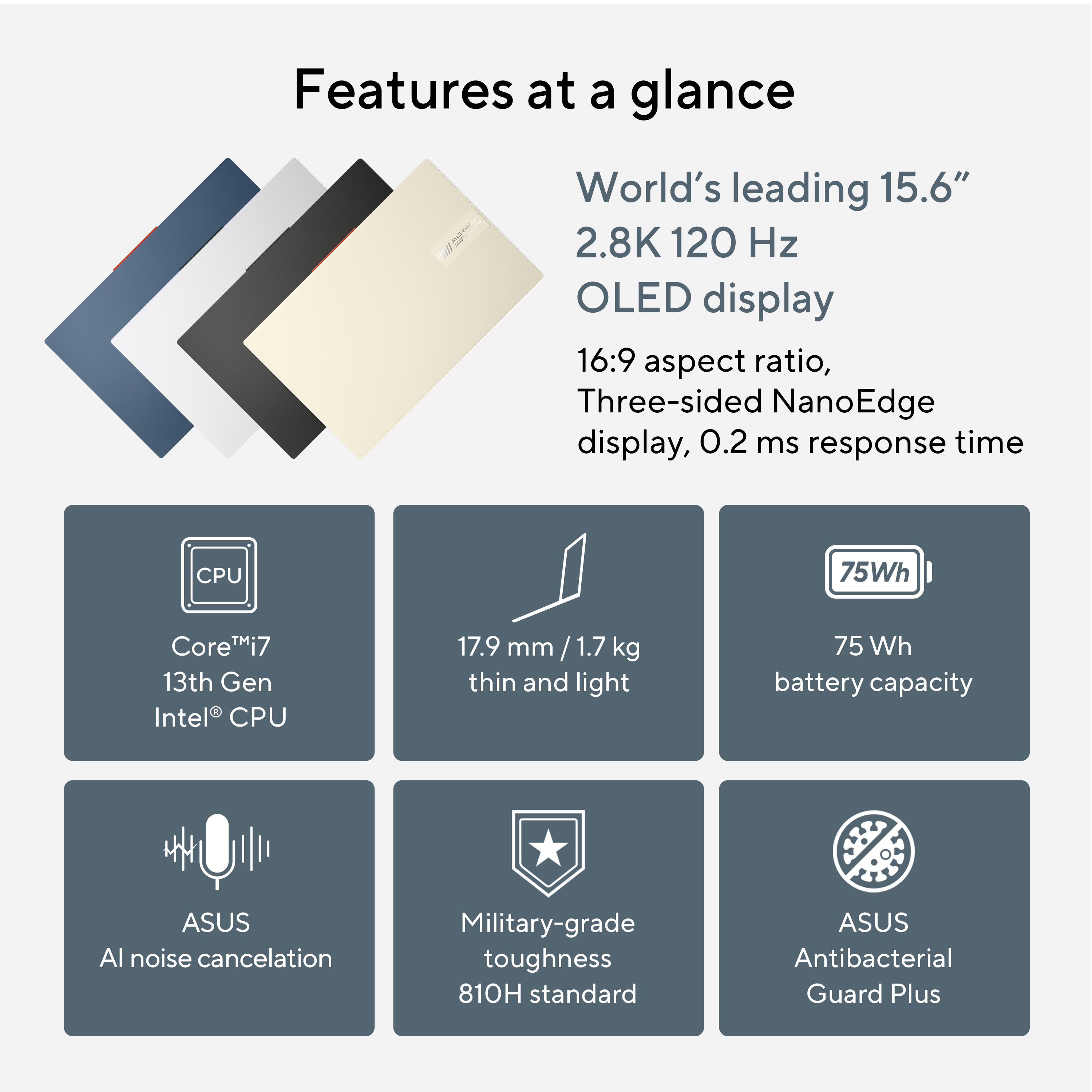 Wherever possibility takes you. Unleash the possibilities with Vivobook S 15 OLED, the outstanding laptop for school, work or entertainment. With the awesome power of its 13th Gen Intel® Core™ i9 H-series processor and a high-capacity 1 TB SSD, any task is easy — work or play, anywhere, anytime. And everything will look its best on the world-leading 15.6-inch Full HD 60 Hz OLED display! The super-stylish new design with its brilliant colors shouts your personality to the world. Explore further and faster with Vivobook S 15 OLED! |