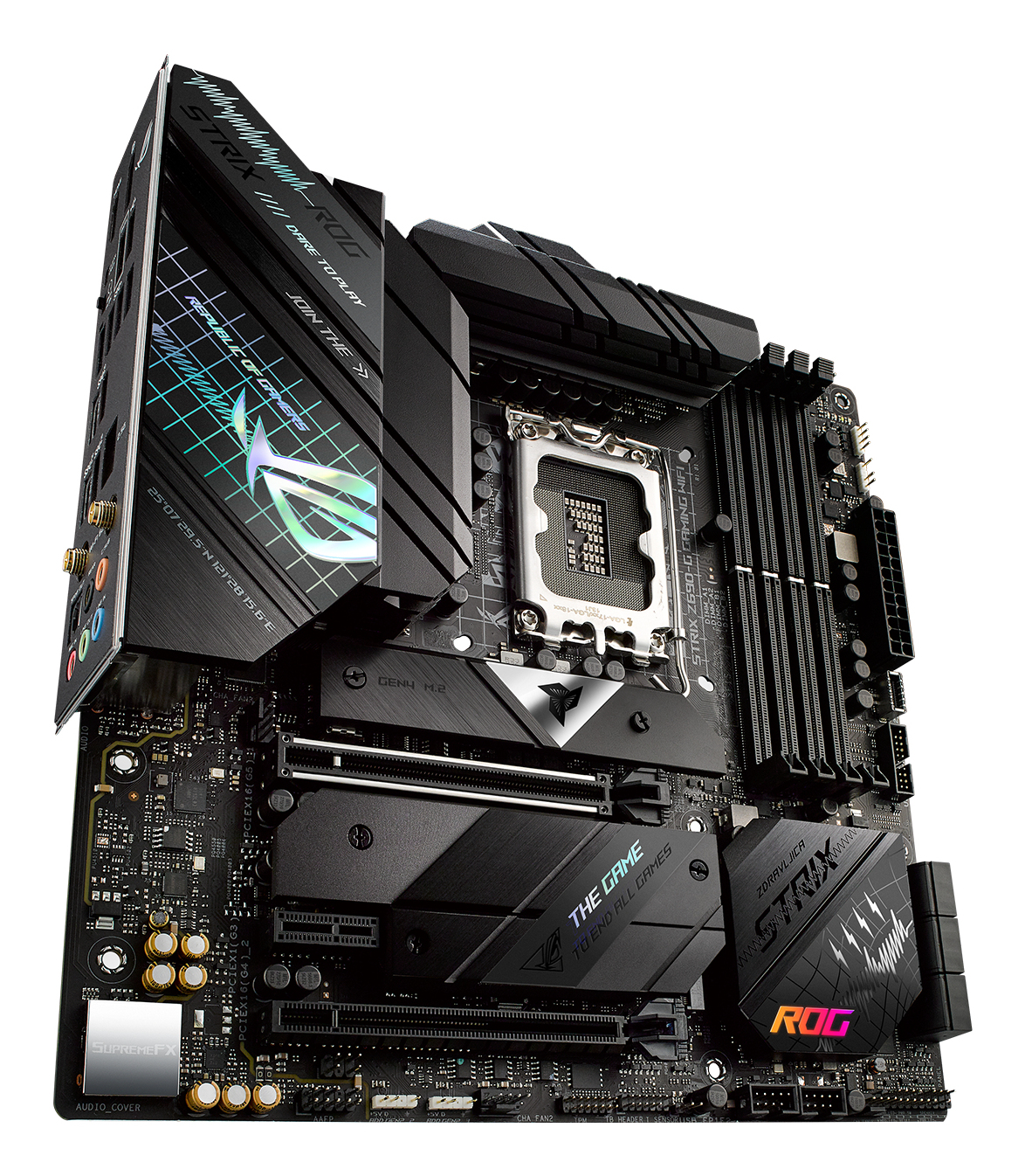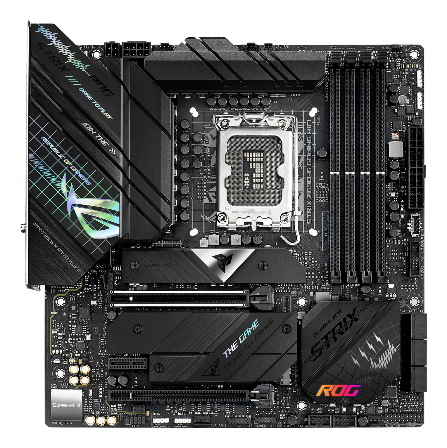 ROG STRIX Z690-G GAMING WIFI ROG Strix Z690-G Gaming WiFi is the premiere choice for enthusiasts who enjoy building compact mATX setups. Premium-grade power delivery, cooling, and the latest networking standards have been packed in to ride alongside DDR5 and PCIe 5.0, unleashing the full force of 12th Gen Intel® Core™ processors. And layered on top, there’s a stack of ASUS-exclusive intelligent controls to optimize every aspect of system performance. POWER DESIGN Digital power control and an array of power stages provide the muscle needed to control the latest Intel CPUs. Integrated I/O cover & VRM heatsinks Two thick heatsinks that are bonded to the metal I/O shield cool the VRMs. This structure provides ample mass and surface area to deal with the thermals of Intel’s latest processors. Thermal pads Specially engineered thermal pads efficiently transfer heat from the inductor and phase array to the heatsink. Two M.2 heatsinks Multiple M.2 heatsinks help maintain onboard M.2 NVME SSDs at optimal temperatures for consistent performance and reliability. Two M.2 backplates Two integrated M.2 backplates help ensure that high-performance drives deliver peak performance, even when airflow is restricted. COOLER BY DESIGN ROG Strix Z690 motherboards feature comprehensive cooling options that are configurable via the Fan Xpert 4 tool in Armoury Crate or within the UEFI BIOS. CPU fan headers A dedicated pair of PWM/DC fan headers for CPU coolers. AIO pump fan header A dedicated PWM/DC header for self-contained water-cooling setups. M.2 heatsink Keeps a mounted M.2 SSD at the optimum operating temperature for consistent performance and reliability. M.2 backplate Provides additional mass to deal with the thermal load of high-performance M.2 drives. 4-pin PWM/DC fan header Each header supports auto-detection of PWM or DC fans. TWO-WAY AI NOISE CANCELATION This powerful ASUS-exclusive utility leverages a massive deep-learning database to reduce background noise from the microphone* and incoming audio while preserving voices. Distracting keyboard clatter, mouse clicks and other ambient noises are removed so you can hear and be heard with perfect clarity while gaming or during calls. *A splitter cable is necessary when using a 3.5 mm headset. ROG AI OVERCLOCKING ROG AI Overclocking is an intelligent utility that helps you get the most out of your build by automatically profiling your CPU and cooling system to predict optimal voltage and frequency settings. Accessible via the AI Suite software in Windows or directly through the UEFI, the intuitive AI Overclocking user interface enables users of all levels. A range of customizable settings are available for seasoned overclockers, and an auto-tuning option is available for beginners. AI COOLING ASUS AI Cooling technology automatically manages and controls motherboard-connected fans to ensure optimal settings based on current system load and temperature. AI NETWORKING The proprietary ROG GameFirst VI utility is designed to help all users — beginners, experts, and everyone in between — optimize network settings to ensure smooth online gameplay. New to this generation, GameFirst VI features AI-enhanced identification and boost technologies to ensure faster and smarter network optimization. Identification GameFirst VI analyzes usage patterns and the digital signatures of your applications and compares them to a database of over 200,000 apps. Boost GameFirst VI intelligently switches application priority and adjusts bandwidth, depending on the situation. When gaming, it accelerates and prioritizes game packets to give you supersmooth online gameplay ― even when you're streaming high-quality video or transferring large files. Visualization An intuitive graph provides an overview of real-time network status. Simply click on the tab to view the current bandwidth usage of each application, geolocation status of each network connection, or an analysis of the WiFi channels. DDR5 Overclocking Strength - ASUS Enhanced Memory Profile Comprehensive memory tuning options are the cornerstone of ROG motherboards. For DDR5, the Strix Z690 lineup breaks performance limits by providing a stacked suite of overclocking parameters for not only high-speed kits, but even entry-level memory modules that have a locked power management IC (PMIC). New to overclocking? Click here to learn about the ASUS-exclusive AEMP technology A dedicated circuit on the motherboard safely circumvents DDR5 memory PMIC restrictions, allowing you to step past the default 1.1-volt limit and push frequency and timings to the max. Ordinarily, a restricted PMIC that has been unlocked requires the system to be fully power-cycled each time memory voltage is adjusted. ROG motherboards leverage onboard hardware and firmware to cleverly work around this irksome limitation, enabling voltage adjustments to be applied through the same soft system-reset process employed for previous generations of DDR memory. PCIe® 4.0-Ready With three strategically placed M.2 slots, ROG Strix Z690-G Gaming WiFi leverages mighty CPU and chipset bandwidth to deliver lightning-fast PCIe 4.0 data transfers, Intel NVM Express® RAID, and high-capacity drive options that blaze past traditional SATA-based SSDs. WIFI 6E (802.11 AX) Onboard WiFi 6E technology takes advantage of the newly available radio spectrum in the 6 GHz band. It provides up to three times the bandwidth of the 5 GHz band and up to seven 160 MHz bands to deliver ultrafast wireless networking speeds and improved capacity as well as better performance in dense wireless environments. *WiFi 6E availability and features are dependent on regulatory limitations and co-existence with 5 GHz WiFi. Intel® 2.5 Gb Ethernet Onboard 2.5 Gb Ethernet gives your wired connection a boost, delivering speeds up to 2.5X faster standard Ethernet connections for faster file transfers, low-lag gaming and high-res video streaming. SUPREMEFX ROG SupremeFX is a unique blend of hardwar