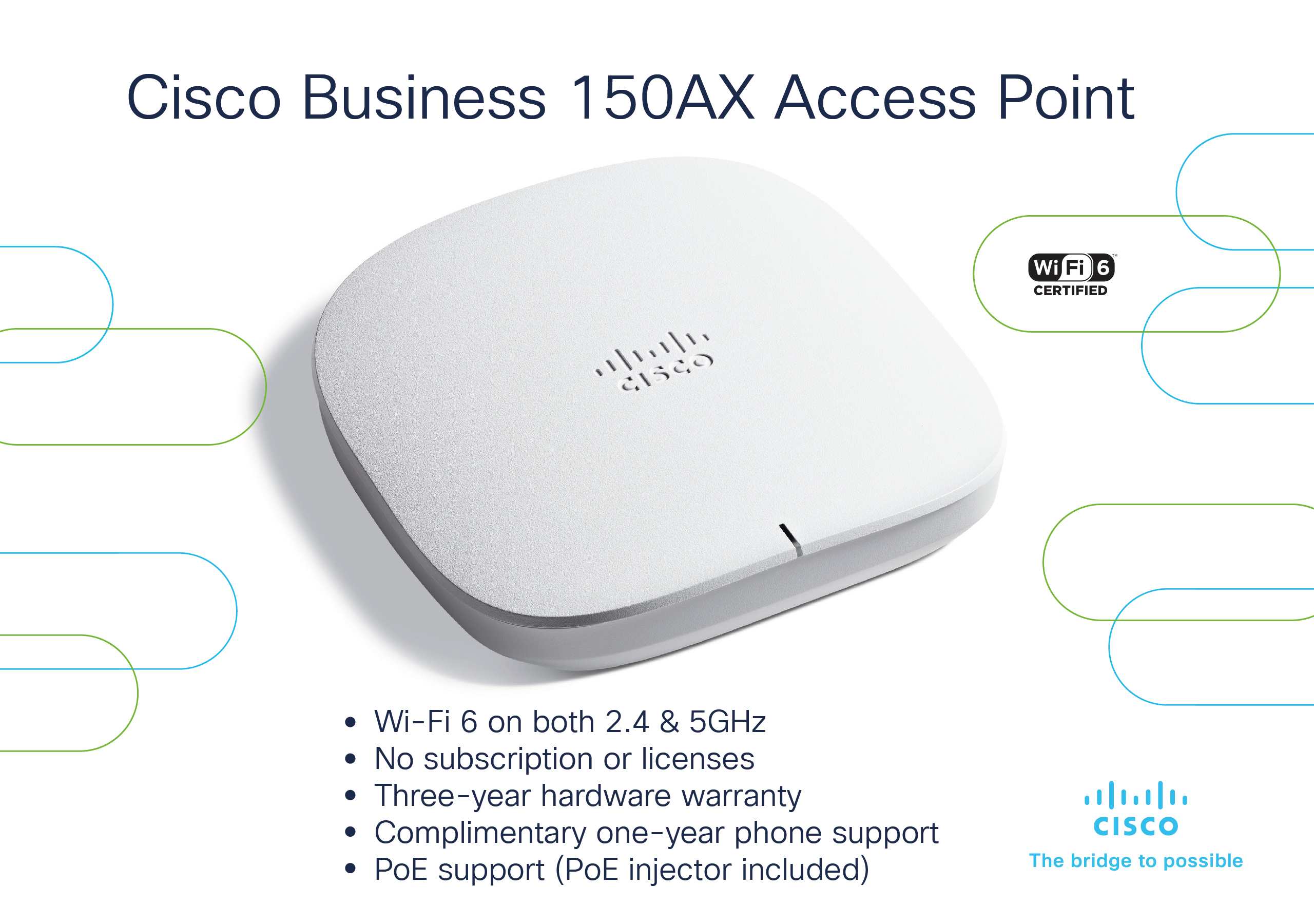Cisco Business 150AX Wi-Fi 6 2x2 Access Point 1 GbE Port, Ceiling Mount, PoE Injector Included, 3-Year Hardware Protection (CBW150AX-E-UK) | Compatible with CBW150AX and CBW151AXM Mesh ExtenderBusiness 150AX Wi-Fi 6 2x2 Access Point 1 GbE Port, Ceiling Mount, PoE Injector Included, 3-Year Hardware Protection (CBW150AX-E-UK) | Compatible with CBW150AX and CBW151AXM Mesh Extender
