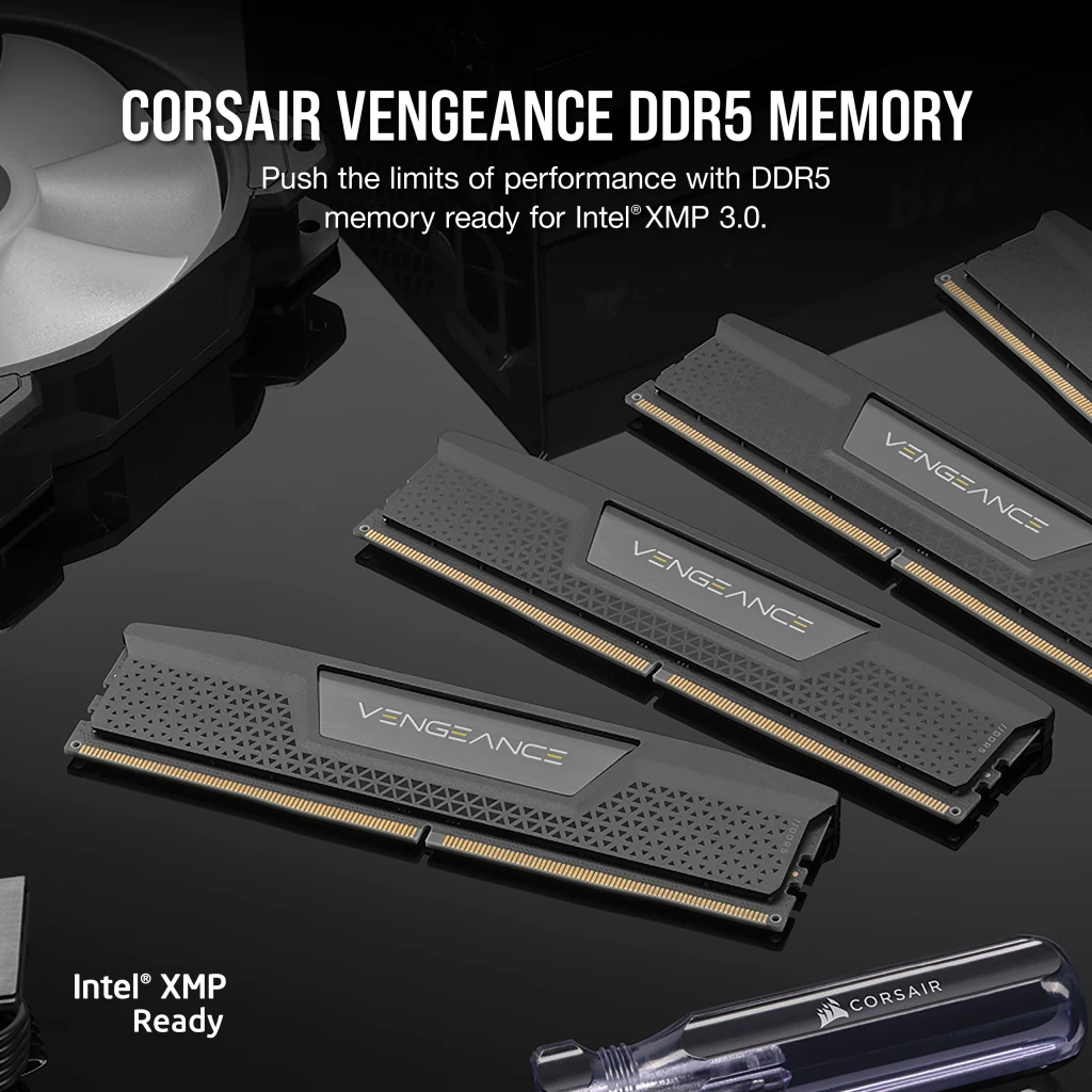 VENGEANCE DDR5 WELCOME TO CUTTING EDGE PERFORMANCE Push the limits of your system like never-before with DDR5 memory, unlocking even faster frequencies, greater capacities, and better performance. OVER 5000MHz SPEED DO IT ALL, AND DO IT FASTER In the many-core era, the unprecedented processing speed of DDR5 ensures your high-end CPU gets data quickly with ease. Whether you are gaming, creating content, opening 100 tabs, or multi-tasking, your PC can power through complex tasks faster than ever before. EASIER THAN EVER ONBOARD VOLTAGE REGULATION You have the power and the control. Built-in voltage regulation with iCUE software control makes for easier, finely-tuned output that provides more stable overclocking than ever. OVERCLOCK IT YOUR WAY CUSTOM INTEL® XMP 3.0 PROFILES Ditch the tedious process of manually adjusting your performance settings each time when you save your own XMP profiles through iCUE. Easily customize and tailor your setting profiles by app or task for greater efficiency. CONTINUING A LEGACY OF PERFORMANCE COMPACT FORM-FACTOR Low clearance ensures wide compatibility with nearly any DDR5 build. HAND-SORTED, TIGHTLY-SCREENED MEMORY CHIPS Ensures consistent high-frequency performance with aggressive timing options. SOLID ALUMINUM HEATSPREADER Conducts heat away from your memory quickly, with refined VENGEANCE styling to fit the look of modern systems. HIGH-PERFORMANCE PCB Guarantees signal quality and stability for superior overclocking ability. WIDE COMPATIBILITY Optimized for the latest Intel® DDR5 motherboards. |