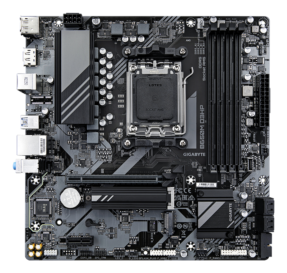 GIGABYTE B650M D3HP Motherboard - AMD Ryzen 9000 Series CPUs, 5+2+2 Phases VRM, up to 7600MHz DDR5 (OC), 2xPCIe 4.0 M.2, 2.5GbE LAN, USB 3.2 Gen 1B650M D3HP Motherboard - AMD Ryzen 9000 Series CPUs, 5+2+2 Phases VRM, up to 7600MHz DDR5 (OC), 2xPCIe 4.0 M.2, 2.5GbE LAN, USB 3.2 Gen 1
