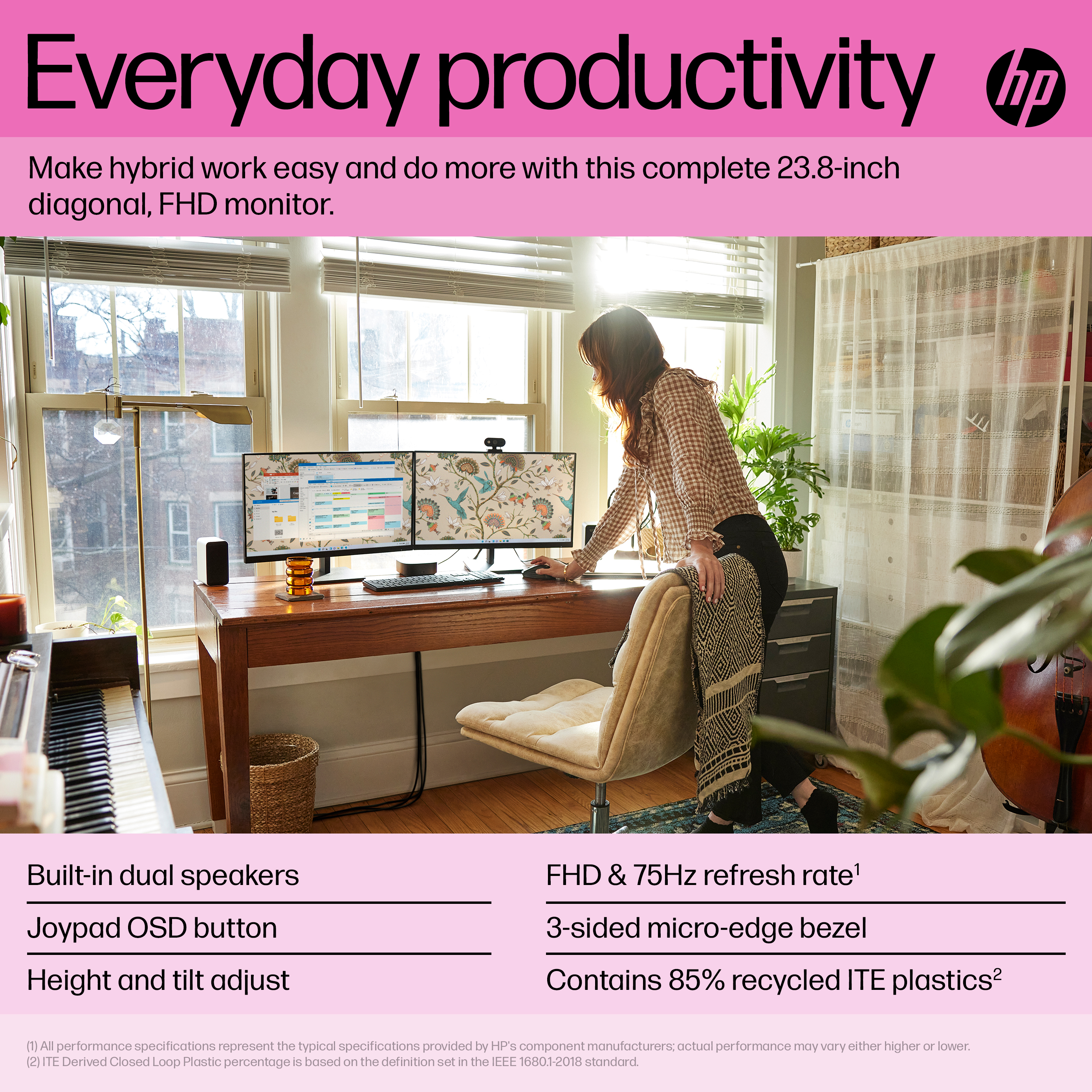 Everyday Productivity Expand your view and your productivity with this 60.5 cm (23.8-inch) diagonal, FHD monitor when you're working from home or at the office. This sleek monitor makes hybrid work easy and complete via a crisp, smooth screen, built-in audio, and simple design, so you can do more everyday. |