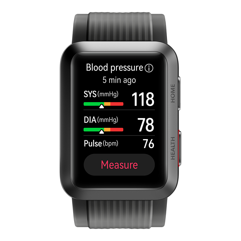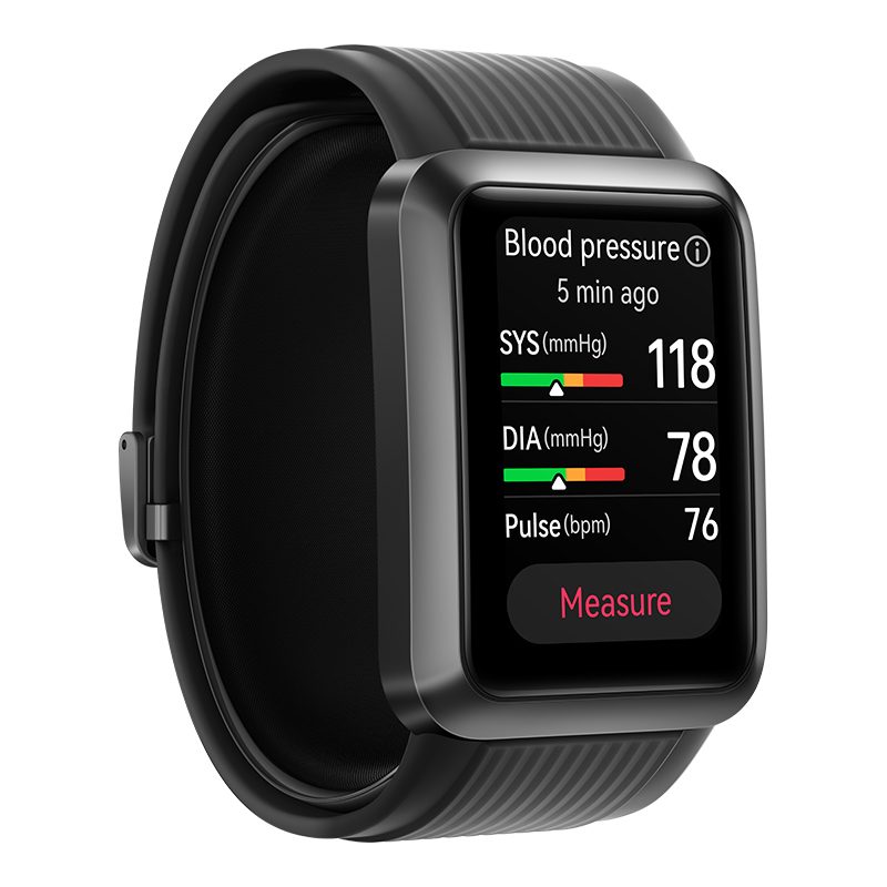 The HUAWEI WATCH D is a smartwatch with a difference. It can measure your blood pressure accurately anytime, anywhere. Pretty handy if you need to take regular measurements or just want to stay on top of your health. HUAWEI WATCH D packs a mini pump and airbag along with a high-precision pressure sensor, so you get accurate results (the margin of error is ±3 mm Hg), just like a regular armband monitor. It doesn't miss a beat either. The ECG sensor monitors your heart rate and can flag irregularities, so you can stay on top of your heart health. Ultimate Comfort HUAWEI WATCH D packs intricate blood pressure components, like a mini pump and airbag, into a highly-compact form. The 2.5D curved glass shimmers and glimmers with each turn of the wrist, complementing a durable aluminum alloy frame, with two handy buttons to take you to your tasks. A Work of Accuracy HUAWEI WATCH D features a margin of error within ±3 mm Hg*, made possible by a high-precision pressure sensor, meticulous pressure feedback controls, and less air-resistance. The macromolecular tensile strap, ergonomically-arced airbag, and butterfly clasp, are all designed to remain stable during inflation, to enhance the precision of impromptu blood pressure readings. Tells You More HUAWEI's proprietary HUAWEI TruBP™ blood pressure algorithm, which is based on a cascade model and different blood pressure patterns, makes HUAWEI WATCH D sensitive and considerate to the wearer's every need, with smart measurement assistance, abnormal posture detection, and a host of other high-level capabilities. Smart Blood Pressure Reminders HUAWEI WATCH D allows you to set customized measurement plans, based on which it will send out blood pressure reminders at scheduled times, such as wakeup and bedtime, so that you can stay on top of your blood pressure as soon as it changes. Daily Health Check-in Daily check-in tasks cover a wide range of lifestyle issues, including blood pressure, exercise, and weight, making healthy living a seemingly automatic routine. Anytime Care for the Whole Family The HUAWEI Health App makes it easy to share health data between members of your health community, such as blood pressure reports and abnormal readings5, so that you can always care for loved ones with the consideration that they deserve. Cutting-Edge Heart Health Solutions ECG Analysis that Doesn't Miss a Beat The ECG App packs a high-performance ECG sensor module, which provides single-lead ECG measurements, real-time analysis, and sinus rhythm, atrial fibrillation, and premature atrial and ventricular beat reminders, to stay informed and proactive about major heart health-related risks. HUAWEI TruSeen™ 5.0+ Heart Rate Monitoring HUAWEI TruSeen™ 5.0+ heart rate monitoring technology deploys eight photoelectric sensors deployed in a ring formation, with two groups of light sources, to boost anti-interference capabilities by converging different signals. The watch's ergonomic sapphire rear case curves gracefully around the wrist, while substantially reducing light interference. An updated algorithm tracks heart rate with greater precision via high-fidelity signal processing, with PVD-coated electrodes6 to provide a comfortable, skin-tight fit, for enhanced ECG readings. Healthy Living Made Easy SpO2 Monitoring SpO2 is a key health indicator, and low SpO2 levels can lead to fatigue, memory loss, and other symptoms, or even damage long-term health. HUAWEI WATCH D provides SpO2 monitoring7, so you can keep track of your blood oxygen levels. Sleep Tight Every Night The HUAWEI TruSleep™ 2.0 sleep monitoring algorithm identifies key sleep states, including deep sleep, light sleep, rapid eye movement (REM) sleep, naps, and wake-up times, with sleep quality scores and personalized advice on how to get the best possible night's rest.8 Take it Easy, Take a Deep Breath Stress monitoring is on hand to track and manage any daily trials and tribulations, with calming breath exercises to help ease your mind.8 Skin Detection, Skin-deep and Beyond With a built-in temperature sensor, the watch detects skin temperature, letting you know right away if your skin temperature changes. 70+ Workout Modes With 70+ workout modes9 to choose from, feel free to step outside your comfort zone, or simply run, row, jump rope, or pedal away to your heart's content. The watch recognizes six common workouts10, and comes with GNSS positioning to track your outdoor routes with greater precision. Long Battery Life HUAWEI WATCH D lasts up to 7 days4 on a full charge, with wireless charging. Your All-Purpose Daily Companion Smart voice assistant, music playback control, new alarm, or weather forecast, all you have to do is ask! Please note: - The blood pressure measurement results may present a large margin of error if your posture is unstable (due to diseases such as Parkinson or cerebrovascular disease sequelae), or you suffer from arrhythmia such as atrial fibrillation, severe anemia, peripheral vascular disease, or arteritis. Individuals with pacemakers or other implantable devices are advised not to use the device's ECG feature. Before using, please carefully read the Instructions for Use. - This device supports a wrist circumference of 13.0 cm to 20.0 cm, and comes packaged with L- and M-sized straps and airbags. Please measure your wrist circumference before purchasing the device. |