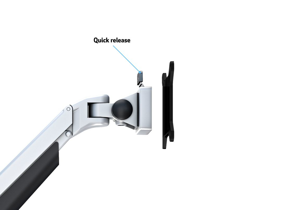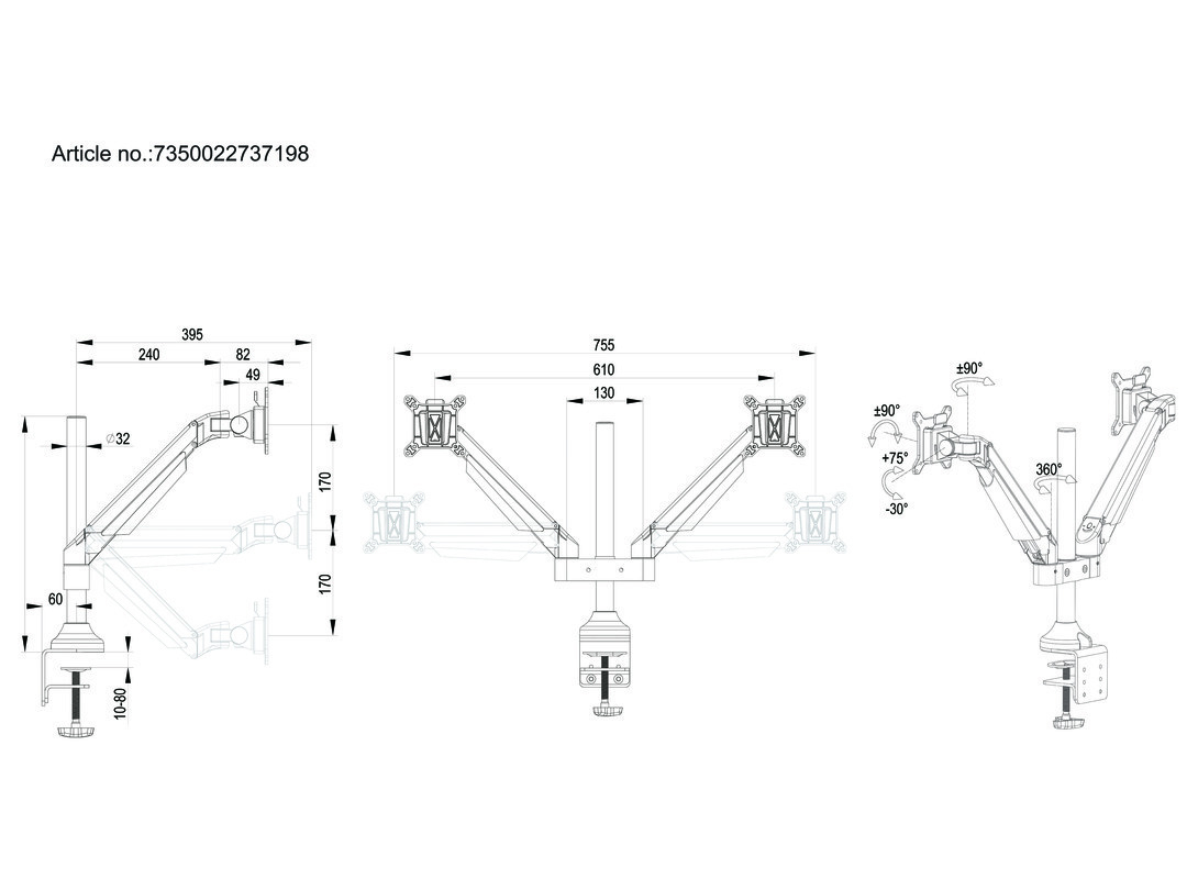 The Dual triple jointed gas suspended monitorarm was designed by Multibrackets to optimize your productivity and help reducing strain on neck, back and eyes. The M Vesa Gas Lift Arm is made out of a durable aluminum construction and uses a gas driven suspension technique. This makes the screens "float" and they can be moved with near zero effort. Sleek and streamlined, the M Vesa Gas Lift Arm frees up space and allows positioning of your displays for greater productivity. Fingertip tilt provides smooth adjustment for two LCD´s in any direction. Easy move the screen from landscape to portrait position or move the screens close to the desk, high up, matching almost any wanted working position imaginable. Supports VESA standards 75x75 and 100x100 and holds screens weighing from minimum of 2kg and up to maximum of 10kg each. The snap on heads gives a fast assembly and disassembly of the LCD perfect for any IT department who wants to minimize downtime. The M Vesa Gas Lift Arm Dual holds to your standard workdesk (max 50mm), or assemble it using a workdesk thru hole technique. |