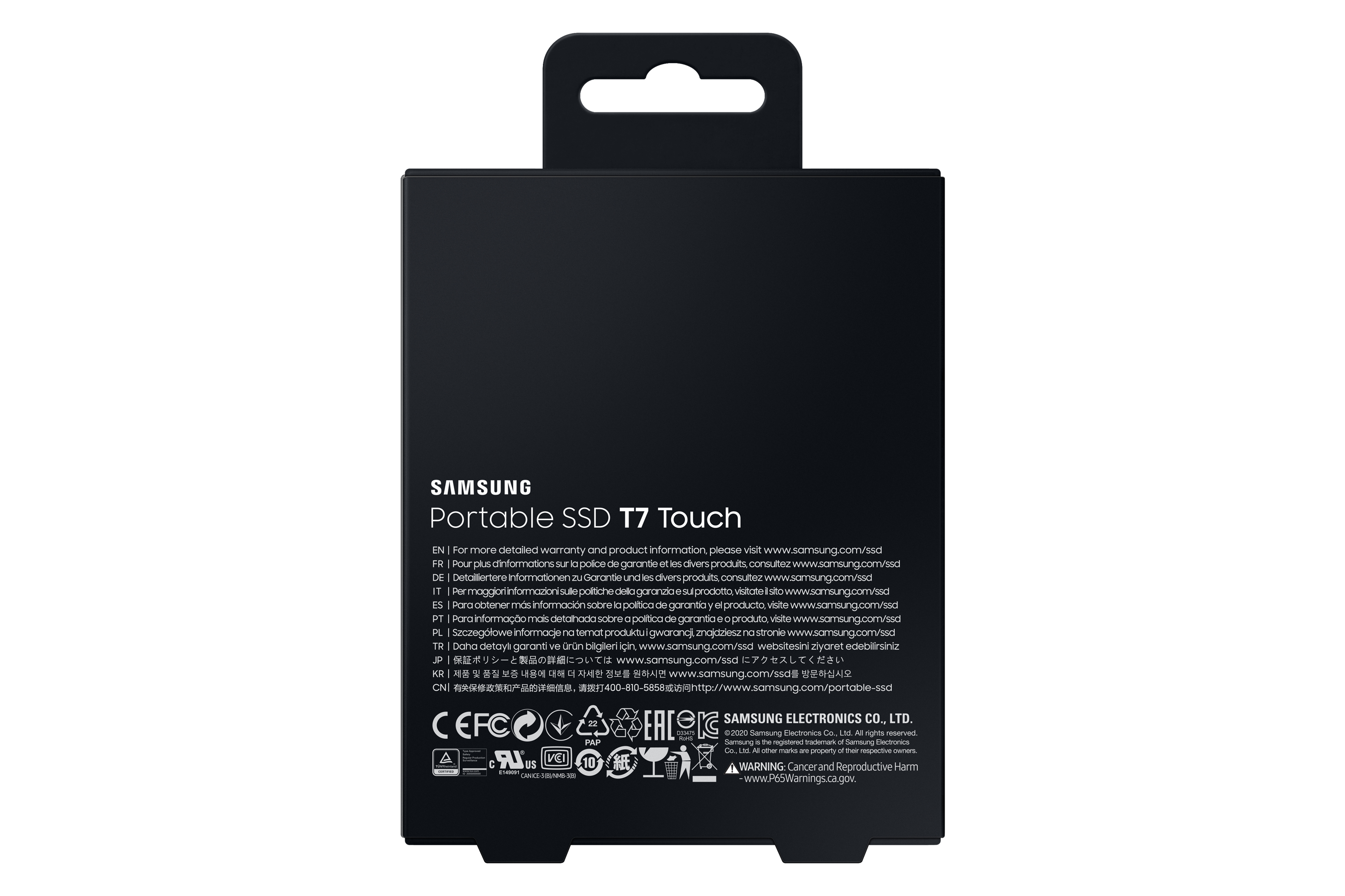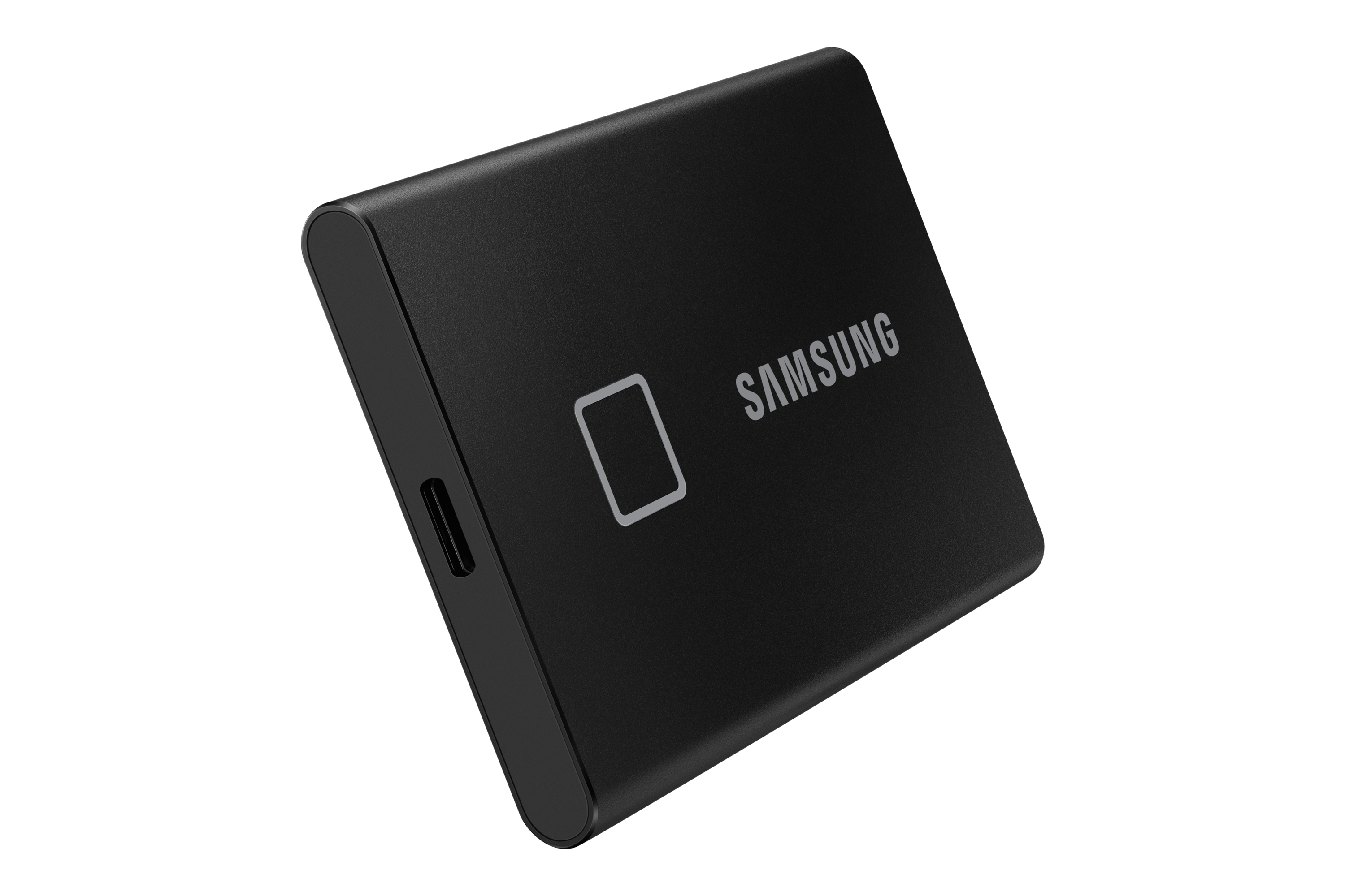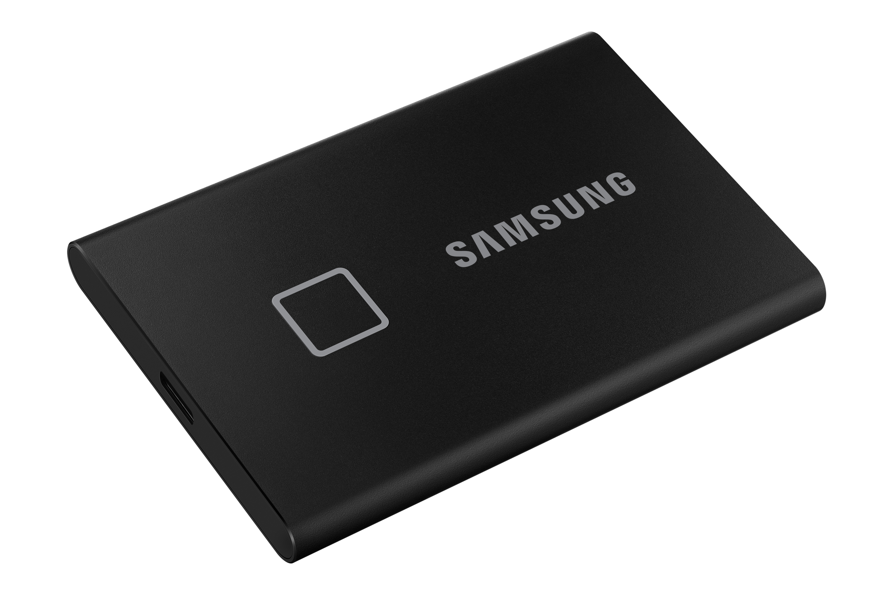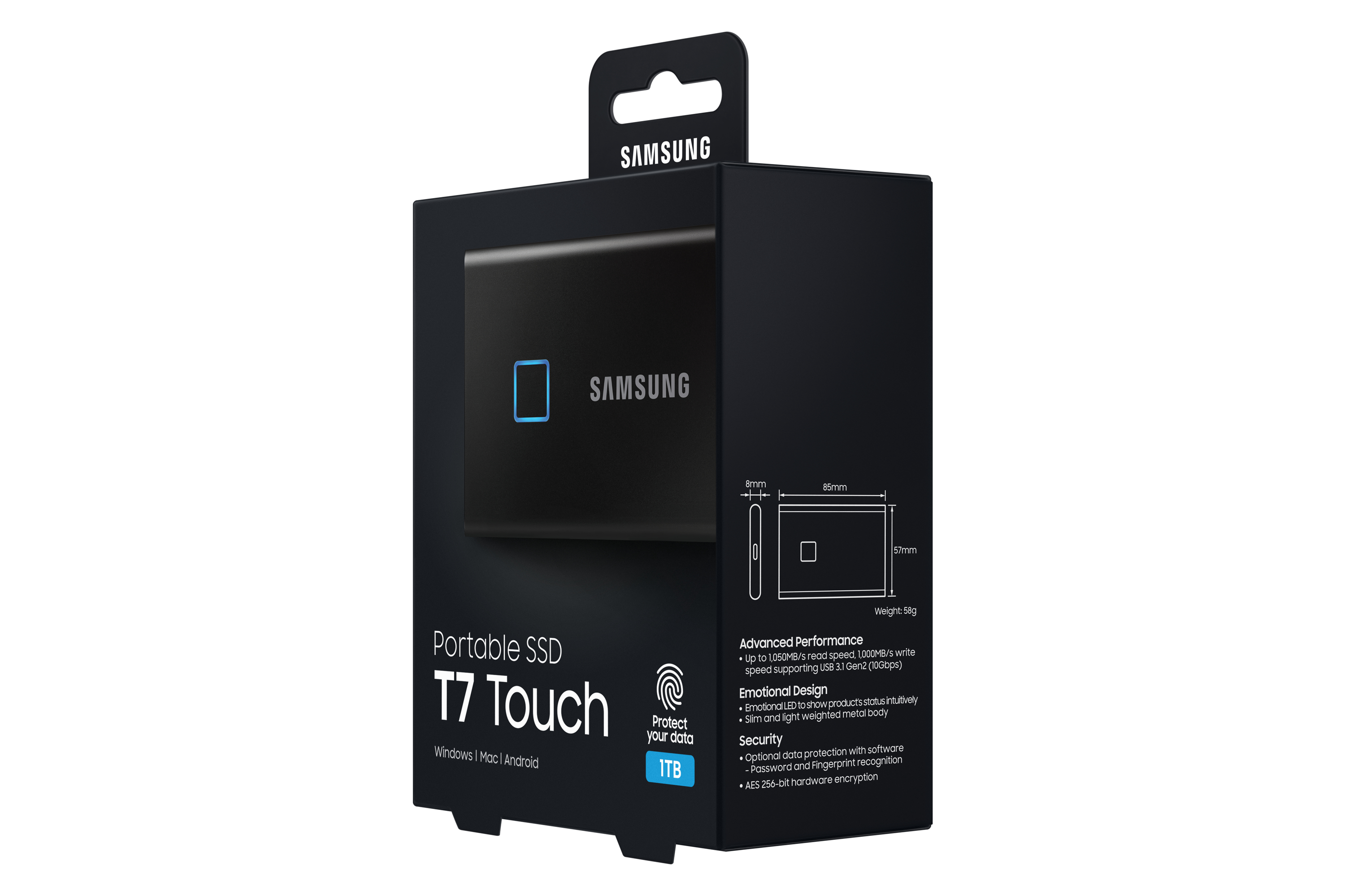 External storage, evolved Whether you're carrying games, movies or sensitive work files, the Portable SSD T7 Touch gives you speed and security in a palm-sized package. Experience the next level of external storage. Transfer in a flash Transfer massive files within seconds with the incredible speed of USB 3.2 Gen2 on the T7 Touch. The embedded PCIe NVMe™ technology facilitates sequential read/write speeds of up to 1,050/1,000 MB/s, respectively, making the T7 Touch almost twice as fast as the T5. Built strong and safe Durable design SSD stands for Solid State Drive, which means it's built with no moving parts. A sturdy metal body encases the immobile hardware, keeping your data intact from falls of up to 2 meters. And the T7 Touch is confidently backed by a 3-year limited warranty. Secure with a touch Keep your private files secure without sacrificing convenience. The built-in security options on the T7 Touch utilise the AES 256-bit encryption and give you the option of unlocking with a touch of your finger or with a password. Enlightening motion LED The T7 Touch features an LED square that illuminates to keep you informed of what your SSD is doing at a glance. Choose from classic black, stylish silver and three capacities to suit your needs: 500GB, 1TB or 2TB. Sleek and compact style Pocket-sized and slim, the lightweight body comes standard on the T7 Touch. Roughly the size of a credit card and weighing in at 58 grams, the solid aluminium unibody construction fits comfortably in the palm of your hand. Management software The T7 Touch comes embedded with upgraded software for PCs and Macs to help you set up a password and fingerprints and get the latest firmware updates. You can also download the mobile app for Android smartphones and tablets. Multi-device compatibility Access your files anytime, anywhere. The T7 Touch is compatible with PC, Mac, Android devices, gaming consoles and more. Included in the box are USB Type C-to-C and Type C-to-A cables for added convenience. World's No. 1 Flash Memory Experience the superior performance and reliability that you can only get from the world's number one brand for flash memory since 2002. All firmware and components, including Samsung's world-renowned DRAM and NAND, are produced in-house, allowing end-to-end integration for quality you can trust.  |
