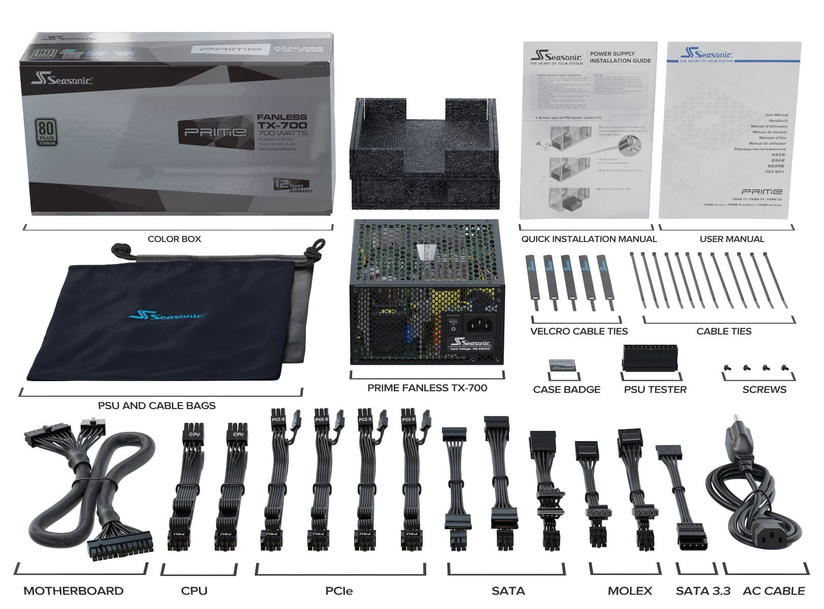 Seasonic PRIME Fanless TX power supply unit 700 W 20+4 pin ATX ATX Black80 PLUS Titanium, 700 W, Intel ATX 12 V, 100 - 240 V, 4.5 - 9 A, 50 - 60 Hz, 150 x 170 x 86 mm