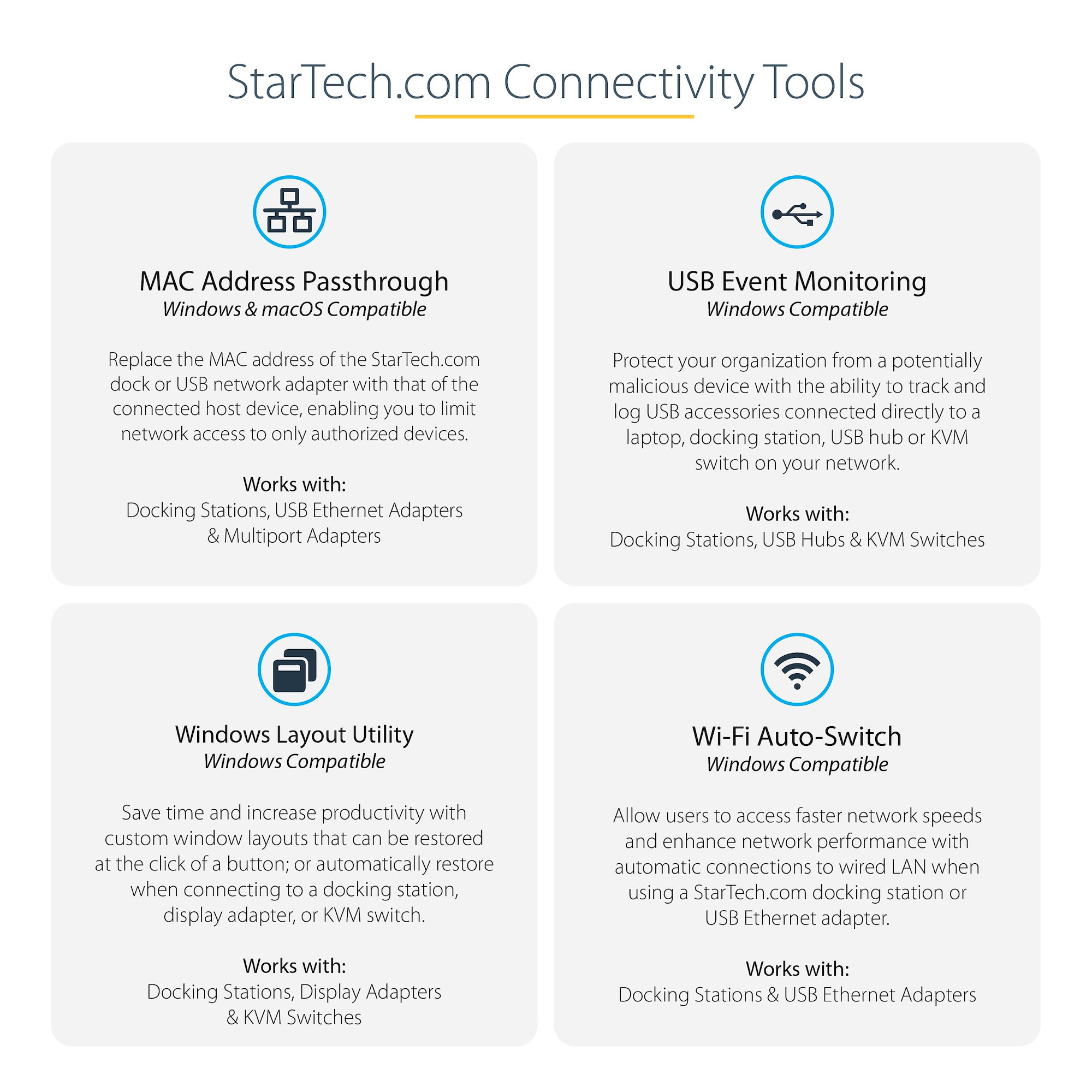USB Type-C Docking Station| Triple 4K with DP 1.4 & HDMI 2.0 | 100W PD | 6x Downstream USB Ports This USB-C Gen 2 10Gbps docking station turns your USB-C ® or Thunderbolt™ 3 Windows laptop or Chromebook into a powerful workstation. A USB 3.2 Gen 2 Type-C dock features everything you need, from triple video outputs up to 4K 60Hz to 10Gbps USB-C & USB-A downstream peripheral ports to 100W Power Delivery. HDMI & DisplayPort for Multiple Monitor Outputs This USB-C Gen 2 docking station with DP 1.4 and HDMI 2.0 HBR3 support, is a perfect choice for dual or triple monitor setup, supporting up to triple 4K 30Hz nearly uncompressed video resolution output , with two DisplayPort and one HDMI outputs. Maximum dual and triple 4K display performance is supported on USB-C 11th Gen Intel-based (DP 1.4 HBR3 with DSC support) Windows Thunderbolt 3 or USB-C laptops, but backwards compatibility to older laptop generations and lower resolution monitor requirements. DP 1.4 HBR3 with DSC Enabled DP 1.4 HBR3 (without DSC) DP 1.2 HBR2 Triple Display Up to 4096 x 2160 @ 30Hz Up to 1920 x 1080 @ 60Hz Up to 1600 x 900 @ 60Hz Dual Display Up to 4096 x 2160 @ 60Hz* *HDMI port + DP port or 2 DP ports Up to 2560 x 1440 @ 60Hz Up to 1920 x 1080 @ 60Hz Single Display Up to 4096 x 2160 @ 60Hz Up to 3840 x 2160 @ 60Hz Up to 3840 x 2160 @ 30Hz Power & Charge with 100W Power Delivery Power and charge USB-C/Thunderbolt 3 workstation laptops & ultrabooks with 100 watt power delivery, to keep high performance laptops sufficiently charged during heavy productivity usage. Charge smartphones and other devices with USB-C downstream charging ports featuring BC 1.2 charging specification. Fast-charge ports support always-on charging so devices will charge whether or not a host laptop is connected. Integrated 6-Port USB Hub & SD Card Reader This USB-C Gen 2 docking station features 6 downstream USB ports in total to connect USB peripherals and an SD 3.0 UHS-I card reader for media storage. • 2x USB-C 3.2 Gen 2 - 10 Gbps (BC 1.2 Fast-Charge + Aways-On) • 2x USB-A 3.2 Gen 1 - 5 Gbps • 2x USB-A 2.0 - 480 Mbps • SD 3.0 UHS-I Card Reader Also included, is a gigabit Ethernet port with PXE Boot, as well as 4-position TRRS stereo audio for a headset and mic. Additional Security Features This USB-C docking station comes with plenty of security features two K-slots for a Kensington style laptop lock. Enhance Productivity and Device Management with the StarTech.com Connectivity Tools Application Developed to improve performance and security, StarTech.com Connectivity Tools is the only software suite on the market that works with a wide range of IT connectivity accessories. The software suite includes: • Advanced Windows Layout Utility : To setup and save custom windows layouts. • Mac Address Pass-Through Utility : To improve network security. • USB Event Monitoring Utility : To track and log connected USB devices • Wi-Fi Auto Switch Utility : Enabling users to quickly access faster network speeds via wired LAN. For more information and to download the StarTech.com Connectivity Tools application, please visit: www.StarTech.com/Connectivity-Tools The StarTech.com Advantage |