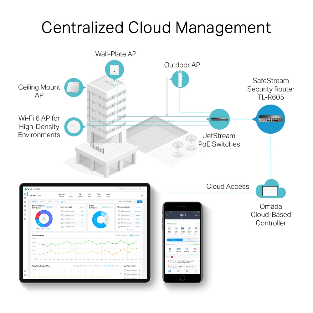 Professional, Secure, and Reliable Gigabit Multi-WAN VPN Router with Centralized Management Capability Omada SDN—The Smarter Cloud Solution for Business Networking As the gateway that seamlessly integrates into the Omada Software Defined Networking (SDN) platform, TL-R605 allows for remote and centralized management, anywhere, anytime. Standalone management via the Web UI or app is also available to maximize convenience. Hassle-Free Centralized Cloud Management: 100% centralized cloud management of whole network from different sites—all controlled from a single interface anywhere, anytime. Up to Four WAN Gigabit Ports to Optimize Bandwidth Usage Three freely interchangeable ports that can be set to either WAN or LAN allow the router to support up to four WAN ports to satisfy various internet access requirements through one device. The multi-WAN Load Balancing function distributes data streams according to the bandwidth proportion of every WAN port to raise the utilization rate of multi-line broadband. Highly Secure VPN TL-R605 supports IPSec/PPTP/L2TP VPN over IPSec/SSL protocols. With a powerful hardware design, the router supports and manages up to 20× LAN-to-LAN IPsec, 16× OpenVPN*, 16× L2TP, and 16× PPTP VPN connections. One-click auto IPSec VPN* greatly simplifies VPN configuration and facilitates network management and deployment while also securing and encrypting private site-to-site data communications traveling over the internet. Internet Access Management Strategy Standardize users’ online behavior and easily specify the internet access rights and strategies of employee via IP/MAC/URL Filtering and Access Control List (ACL). Captive Portal authentication facilitates network resource control by capturing, authenticating, and classifying user access. Appropriate network resources can also be allocated for particular users or guests. Easy Management with the Omada App Follow configuration instructions on the free Omada app to get set up in minutes. Omada lets you configure settings, monitor the network status and manage clients, all from the convenience of a smart phone or tablet. |