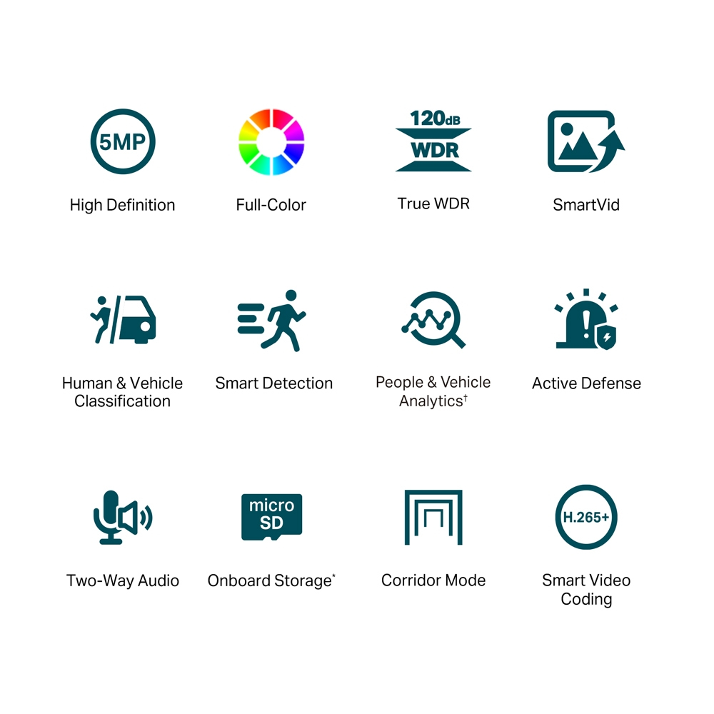 All The Colors, All The Time 5MP Full-Color Turret Network Camera 24/7 Stunning Visual Experience 5MP Super-High Definition Monitor 24-hour clear and colorful details even in pitch dark night. VIGI Full-Color camera provides maximum 5MP resolutions and ensures colorful monitoring with its large-aperture lens, high-sensitivity sensor, and attached supplemental lights. SmartVid-Smart Video Enhancement VIGI’s professional technologies process videos to greatly improve their quality that is vital to your monitoring, including WDR, 3D DNR, Smart IR, and Night Vision. Human & Vehicle Classification Integrated AI chips support advanced algorithms to distinguish humans and vehicles from other objects. You can flexibly customize alarm rules to match your monitoring needs and receive more accurate event notifications. Comprehensive AI Detection with Pre-Set Rules Supported By setting the detection rules in advance, VIGI AI-powered cameras can accurately capture various abnormal events. This will greatly reduce false alarms and cover your specified monitoring needs in different scenarios. People & Vehicle Analytics Quickly find people and vehicles of interest using a series of attributes. People Analytics Filter people of interest by various attributes, such as gender, hair length, and clothing, allowing you to improve search efficiency. Vehicle Analytics Identify and search for vehicles of interest based on vehicle color and type for targeting meaningful events in a short time Active Defense Warn potential intruders instantly with sound and light when abnormal events Two-Way Audio With voice intercom support, carry two-way conversations while watching your feed from anywhere. Corridor Mode Rotate the live image and lens 90° clockwise simultaneously. This way, your image aspect ratio changes from 16:9 to 9:16, helping you monitor long and narrow areas and providing a more natural viewing experience. Smart Video Coding by H.265+ Compresses the video size without sacrificing video quality, easing the network load and saving disk space. Flexible Storage Local storage is available for each method, as well as onboard storage with an SD card slot (up to 256 GB). Plug & Play with One Cable Enjoy simple wiring with PoE connections. Connect your camera with an RJ45 cable, then your power supply and data transmission are all settled. One system. Full security. Run your business with peace of mind. The VIGI professional surveillance system by TP-Link is dedicated to protecting the business you’ve worked hard to build — whenever, wherever. Our outstanding functions, reliable quality guarantees, and simplified installation work together to ensure your business stays safe and sound. |