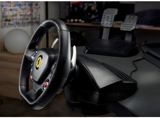 T80 Ferrari 488 GTB Edition 8:10 scale replica of the Ferrari 488GTB, officially licensed by Ferrari, and designed to offer total realism in all PS4™ racing games that support wheels. Officially Co-Licensed by Ferrari and Sony for PlayStation®4 8:10 scale replica of the Ferrari 488GTB, officially licensed by Ferrari, and designed to offer total realism in all PS4™ racing games that support wheels. Built-in "PS", "SHARE" and "OPTIONS" buttons for easy navigation of the PS4™ system and in-games menus The wheel Ergonomically-designed wheel, optimised for all types of racing games on the PlayStation®4 system (GT, F1, Stock car, Rally, Arcade, etc.) Rubber textured cladding on the wheel's grip surfaces Realistic linear wheel resistance with automatic re-centering (exclusive Thrustmaster® “Bungee Cord” system) Comprehensive controls: 11 action buttons + multidirectional D-pad to navigate through menus Wheel-mounted sequential paddle shifters: 2 up and down digital paddle shifters let you switch gears more quickly 2-pedal pedal set included Large pedal set with adjustable angle of inclination and wide foot-rest for ultra-precise, comfortable acceleration and braking Central clamping system with wide jaws for optimal stability Bungee Cord return to center mechanism (Thrustmaster patent) Realistic linear wheel resistance with automatic re-centering (exclusive Thrustmaster® “Bungee Cord” system) Box contents Racing wheel, 2-pedal pedal set, attachment system, user manual and warranty information |
