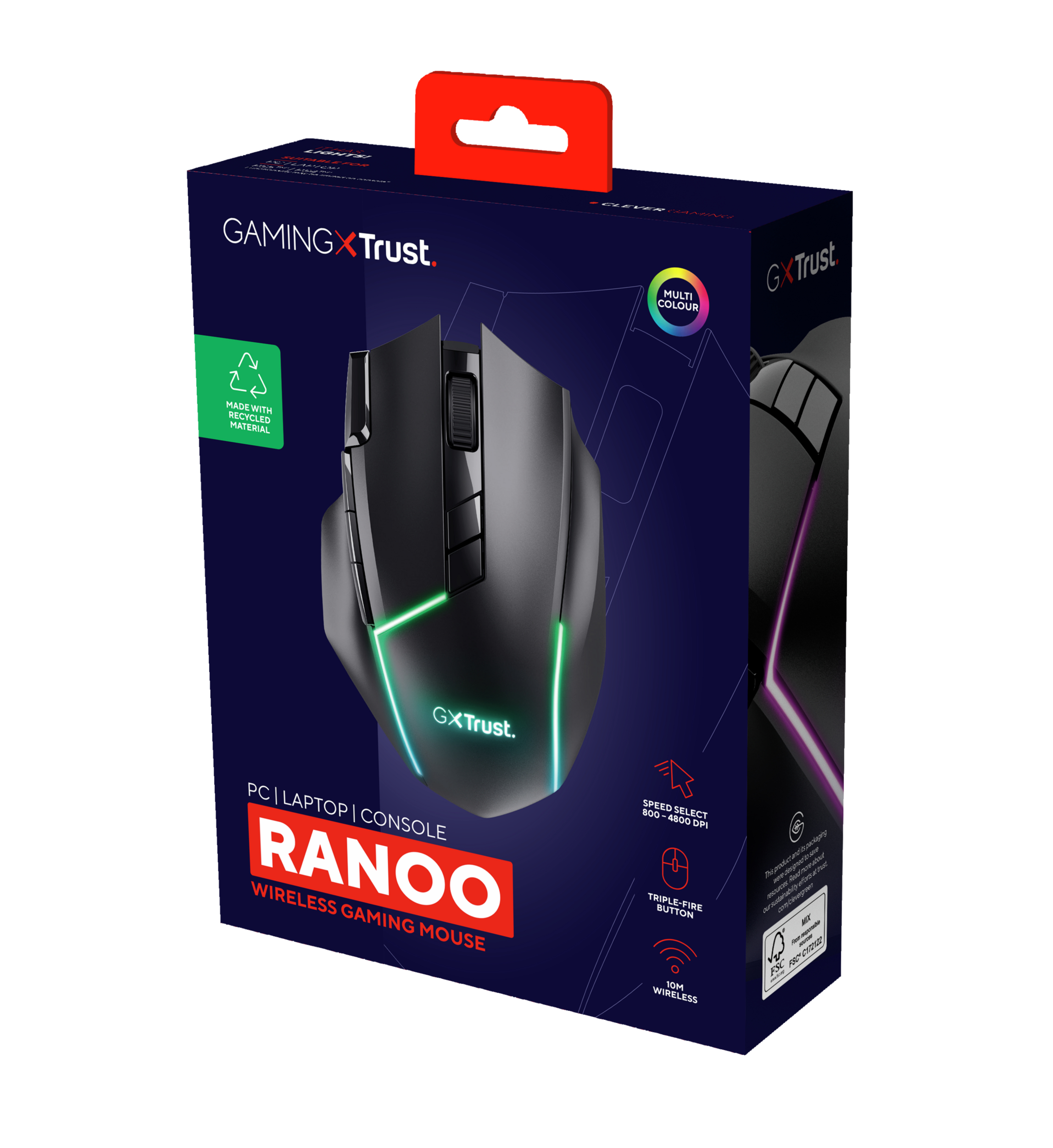 Trust GXT 131 Ranoo mouse Gaming Right-hand RF Wireless Optical 4800 DPIRF wireless, 800 - 4800 dpi, 2x AA, 10 m, 86 x 124 x 42 mm, 90 g