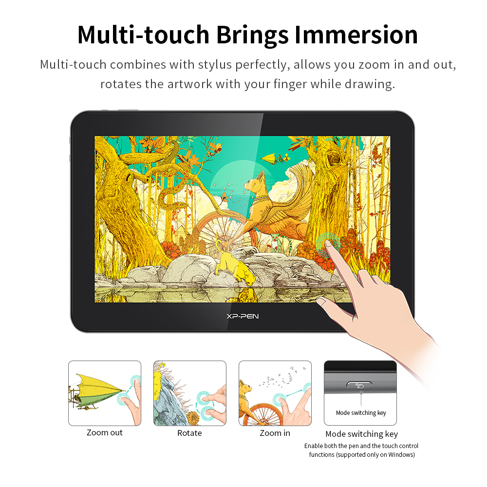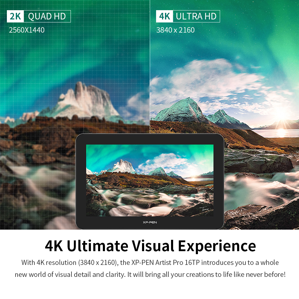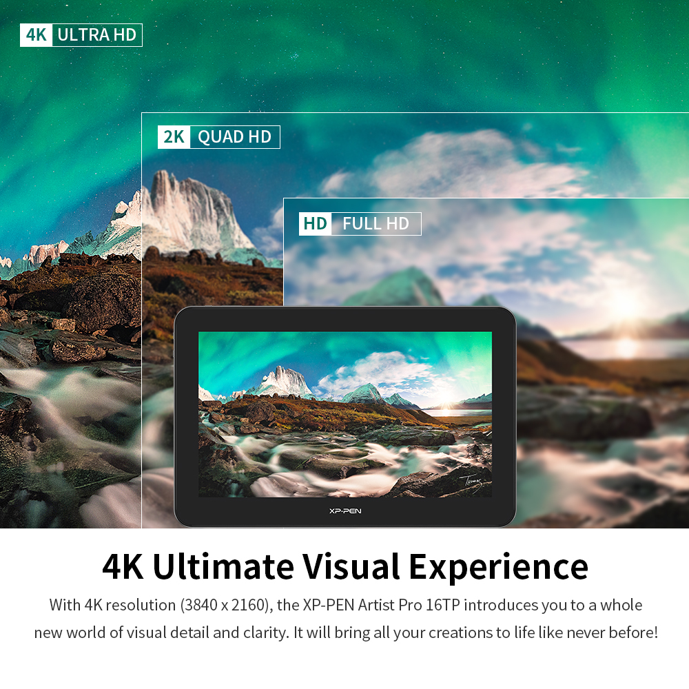 4K Ultimate Visual Experience With 4K resolution (3840 x 2160), the XPPen Artist Pro 16TP introduces you to a whole new world of visual detail and clarity. It will bring all your creations to life like never before! The Most Natural Colors With 92% Adobe RGB, 124% sRGB in color gamut and a 1000:1 contrast ratio, the XPPen Artist Pro 16TP delivers natural color transition, super color accuracy and saturation. Incredibly Innovative, Extremely Comfortable The Artist Pro 16TP offers a perfect balance between "Non-grainy" and "Anti-glare", providing a solution to one of the key technical problems in the industry. By reducing the AG glass’s surface roughness, narrowing particle spacing, and preventing convex lens amplification effect, this pen display delivers a stunning visual experience with neither grainy dots nor reflection interference. Relieve eye fatigue and release your creativity with ease. Multi-touch Control, Easy to Use Support multi-touch control of great flexibility and usability. Interact with the device in multiple ways for a more intuitive and seamless creation experience. Pick Up the Pen and Be Inspired The PH2-D stylus has an eraser at one end, enabling you to instantly modify or remove unwanted marks without having to switch between settings. Supporting up to 60 degrees of tilt action and with 8192 pressure sensitivity levels allows you to create exquisite lines and seamless shading. Metal Cover, Fancy Flavor Durable metallic back, effective in heat reduction and stylish in look. It delivers a smooth touch to your fingers and sparks inspiration throughout the drawing process. Simplicity Meets Functionality The streamlined design push-push pen case provides quick access to keep your pen and pen nibs safe. Take it with you wherever you go. A New Level of Professionalism The Artist Pro 16TP has two full-featured USB-C ports that can be easily connected, supporting a USB-C to USB-C connection, giving you a tidy desktop and more connection options. The extra security slot at the side also allows you to protect your display. |